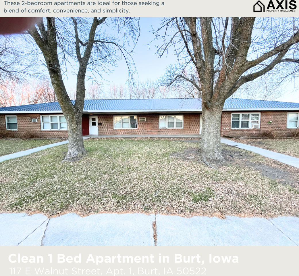 Comfortable Living in Our Cozy 1-Bedroom Apartments Welcome to your new home! Our 1-bedroom apartments offer a comfortable and practical living space, perfect for individuals or couples. These apartments are recently remodeled, ensuring a clean and well-maintained environment for all residents. Compact and Efficient: The layout of our apartments is designed for ease of living. The bedroom is cozy, providing a peaceful space for rest, while the living area is just right for everyday relaxation and dining. Modern Touches: Each apartment comes with essential modern amenities. The kitchen is equipped with up-to-date appliances, making meal preparation simple and enjoyable. The living spaces are uncluttered, offering a neat and tidy atmosphere. Clean and Well-Kept: We prioritize cleanliness and upkeep. You'll find the apartment in immaculate condition upon moving in, and our maintenance team is always on hand to ensure everything stays in top shape. These 1-bedroom apartments are ideal for those seeking a blend of comfort, convenience, and simplicity. *Rent rates and availability are subject to change. Images, 3D tours, and renderings of units may be similar to available units and do not necessarily represent the specific units available. Please contact the property for current rates and unit availability. Rental Terms Rent: $450 Security Deposit: $450 Pet Policy Cats allowed Small Dogs allowed Amenities 24/7 Emergency Maintenance Coin op Washer/Dryer Utilities included: Trash Lawn Care Snow Removal Over 2" Appliances Stove/Oven Refrigerator