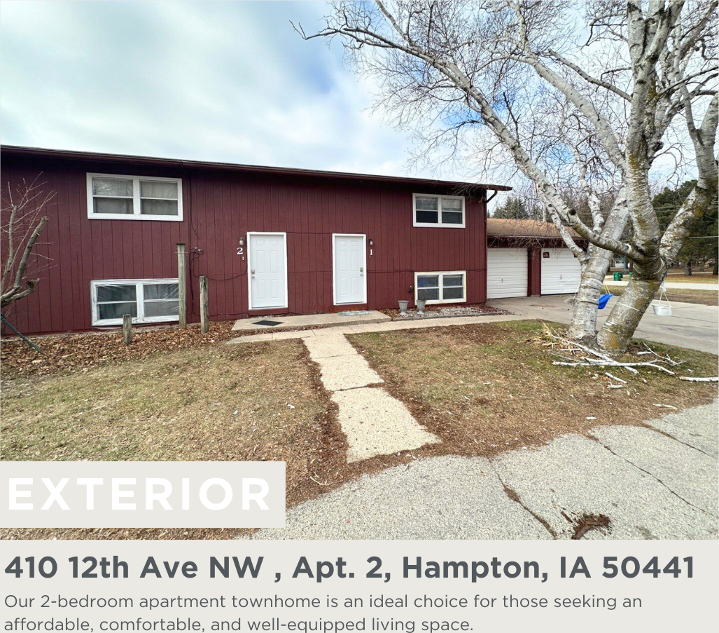 | 2 Bedroom Townhomes | 2 bed | 1.5 bath | $850 /mo | 2 units available | Welcoming 2-Bedroom Apartment Townhome – Affordable, Spacious Living with Convenient Amenities Discover the perfect balance of comfort and affordability in our 2-bedroom apartment townhome. Designed with families and individuals in mind, this townhome offers a practical layout and essential amenities, including the convenience of in-unit main floor laundry hookups, to accommodate your lifestyle without stretching your budget. Two Cozy Bedrooms: Each bedroom is thoughtfully sized for beds and basic furniture, providing personal space for everyone in the family. Functional Living Areas: The living room offers a comfortable space for family gatherings, while the adjacent dining area is perfect for shared meals. Practical Kitchen: Equipped with essential appliances and storage, the kitchen supports daily cooking needs. Convenient Main Floor Laundry Hookups: Experience the ease of doing laundry at home with main floor laundry hookups included in your unit, adding to the practicality of everyday living. Bathroom Accessibility: The townhome includes functional bathrooms, designed for easy maintenance. Ample Storage Space: With closets in the bedrooms and additional storage options, organizing your home is simpler. Our 2-bedroom apartment townhome is an ideal choice for those seeking an affordable, comfortable, and well-equipped living space. Explore a blend of simplicity, functionality, and convenience – contact us to learn more about your new home today! *Rent rates and availability are subject to change. Images, 3D tours, and renderings of units may be similar to available units and do not necessarily represent the specific units available. Please contact the property for current rates and unit availability. Rental Terms Rent: $850 Security Deposit: $850 Pet Policy Cats allowed Small Dogs allowed Amenities 24/7 Emergency Maintenance in-unit laundry hookups Utilities included: Trash Snow Removal Over 2" Appliances Stove/Oven Refrigerator Dishwasher |