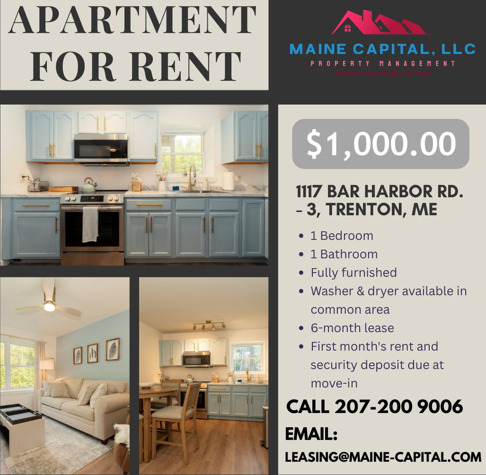 | 1117 Bar Harbor Road - 3 | 1 bed | 1 bath | $1,000 /mo | Fall Rental – Available November 1st – May 15th Enjoy a fully furnished and hassle-free seasonal stay from November 1st through May 15th. Perfect for a winter getaway, remote work, or temporary housing needs. - Washer & Dryer available in common area - 6-month lease - First month's rent and security deposit due at move-in Contact us today to schedule a viewing or learn more about this unit! |