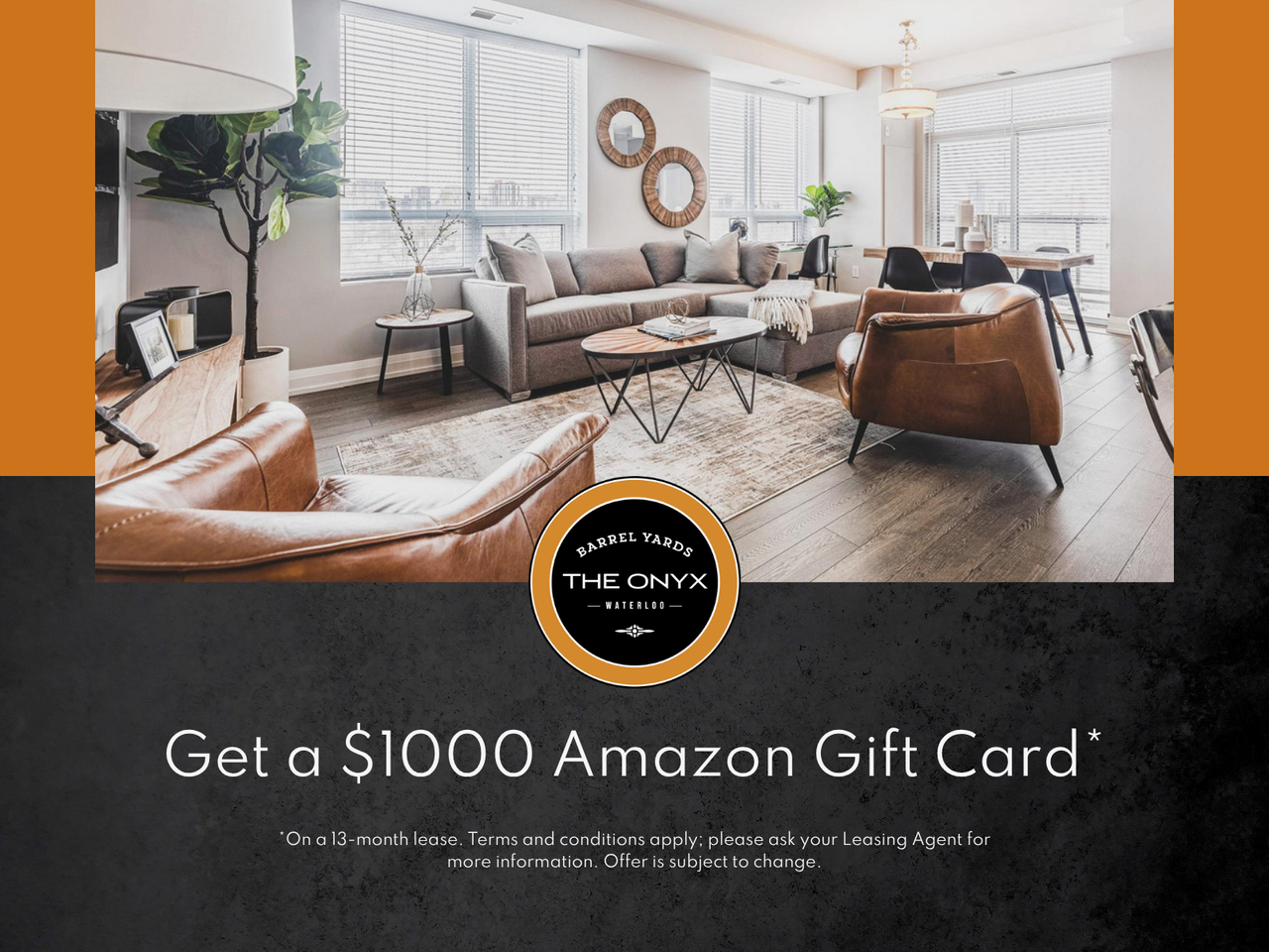 Limited Time: $1000 Amazon Gift Card Receive a $1000 Amazon gift card when you sign a new 13-month lease before April 30, 2026. Terms and conditions apply; ask a Leasing Agent for more information.
