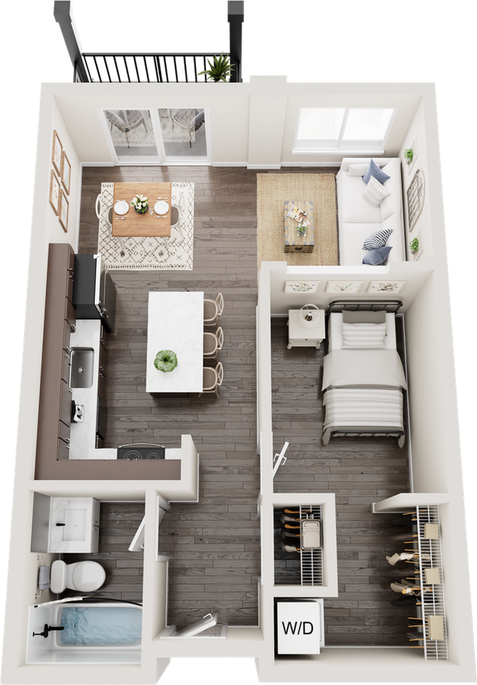 | Alcove B.2 80% | 1 bed | 1 bath | 547 sqft | $1,340–$1,429 /mo | 2 units available | This one-bedroom unit features a transom wall design that allows natural light to flow between the living area and bedroom. The apartment includes a modern kitchen with energy-efficient stainless-steel appliances, energy efficient air conditioning & in-floor radiant heat, quartz countertops, and ample storage. Additional features are laminate wood flooring, contemporary fixtures, a stackable washer and dryer, window coverings, ceiling fans, a large closet, and a balcony. This unit is an affordable apartment based on 80% of the Area Median Income (AMI) and does have income restrictions. The max gross income is $60,838 for one person, per year. |