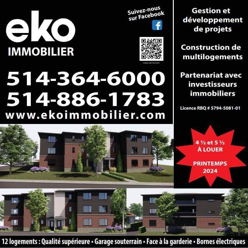 🏠 Logements 4 ½ et 5 ½ neufs à Napierville 🗓️ Libre juillet 🍽️🍳🍴 Comptoirs de quartz. ❄️🔥💲Thermopompes (Climatisation, chauffage et économie d'énergie). 🎧 Insonorisation supérieure (Planchers de béton, laine insonorisante, Panneau Sonopan entre les logements et le corridor). 🅿️ 18 Stationnements souterrains. 🚗⚡Bornes pour véhicules électriques ($). 🚪Généreux rangements dans les logements. 🔒Casiers privés au garage ($) 🔽💡💲Très bas coûts énergétiques (Isolation 40% mieux que le Code + thermopompe). 🏫🎈Situé à 100 m d'un CPE (Jeunes Pousses des Jardins-du-Québec). 🐱 Chat accepté. 🐶 chien interdits 🚭Cigarettes et 🌿marijuana interdites (Incluant sur balcons). 🕵️♂️📋 Enquête prélocation obligatoire (Mauvais dossiers refusés). 💲4 ½ à $1,725 💲5 ½ à $1,825 💰Aucun des rabais n'est applicable pour les locations avec chien. 381 de l’Église, Napierville À 15 minutes de St-Jean et de Candiac.