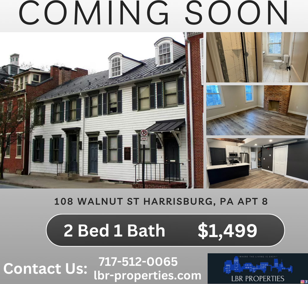 | 108 Walnut Street - 8 | 2 bed | 1 bath | $1,499 /mo | LBR Properties has a brand new, fully renovated 2-bedroom apartment for rent. This apartment features stainless steel appliances, beautiful loft, granite countertops, custom tile shower, washer and dryer in the apartment, central AC and much more!! Storage unit available for an additional monthly fee. Perfect location, within walking distance to the river front and restaurant row! You won't want to miss out on this one! Water sewer and trash is included in the rent. Tenant pays electric and gas. Application requirements - 550 credit score, 3x income, good landlord reference. Anyone 18+ must apply separately. *Unpaid eviction(s) and/or judgement may disqualify the application. For serious inquiries, please complete an application online at: https lbr-properties com Feel free to call us with any questions 717-512-0065 |