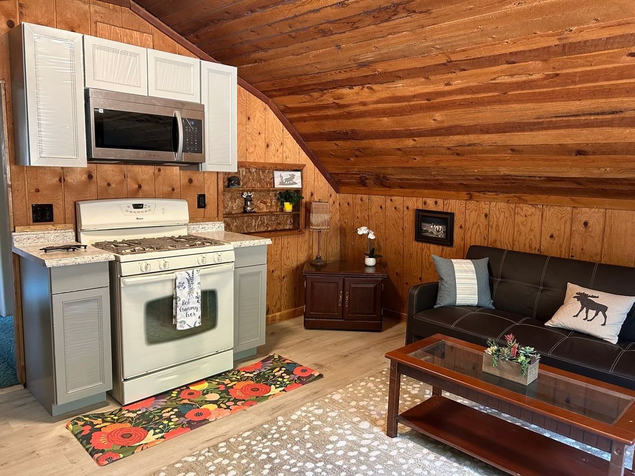 This is a 1 bedroom 1 bathroom unit. There are two lofts that overlook the bedroom and also the living room. This log cabin is furnished with all of Montana in mind. It is furnished