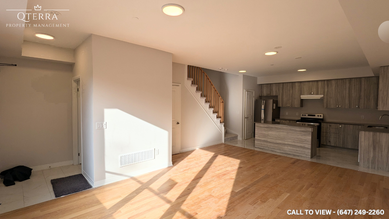 ELEGANT 4-BEDROOM FREEHOLD TOWNHOUSE WITH PREMIUM UPGRADES Text or Call to View: (647) 249-2260 This stunning freehold townhouse offers a perfect blend of modern upgrades and luxurious amenities, making it an ideal home for those seeking comfort and style. With spacious interiors and a prime location, this unit is a rare find. KEY PROPERTY DETAILS: Type: Freehold Townhouse - Bedrooms: 4 - Bathrooms: 2.5 - Size: 2000 SQF - Parking: 2 spots included - Availability: October 15, 2024 - Virtual Tour: [https youtu be RnkiLAgEx-U](https youtu be RnkiLAgEx-U) UNIT AMENTIES: - Condition: Brand new and unfurnished, ready for your personal touch. - Upgraded Kitchen: Enjoy a chef’s dream kitchen with stainless steel appliances, quartz countertops, and an upgraded backsplash. - Flooring: Beautiful hardwood flooring in common areas and cozy carpet in bedrooms. - Ceiling: High 9-foot ceilings that enhance the spacious feel. - Laundry: Convenient ensuite laundry with a dishwasher and microwave included. - Bathrooms: Modern upgraded bathrooms, with an en-suite in the primary bedroom. - Climate Control: Personal thermostat for customized comfort. - Closets: Walk-in closet in the primary bedroom and regular closets in all other rooms. - Natural Light: The open-concept layout is flooded with natural light, creating a bright and inviting atmosphere. BUILDING AMENITIES: - Views: Serene views of the courtyard and backyard. - Balcony: Private balcony for outdoor relaxation.