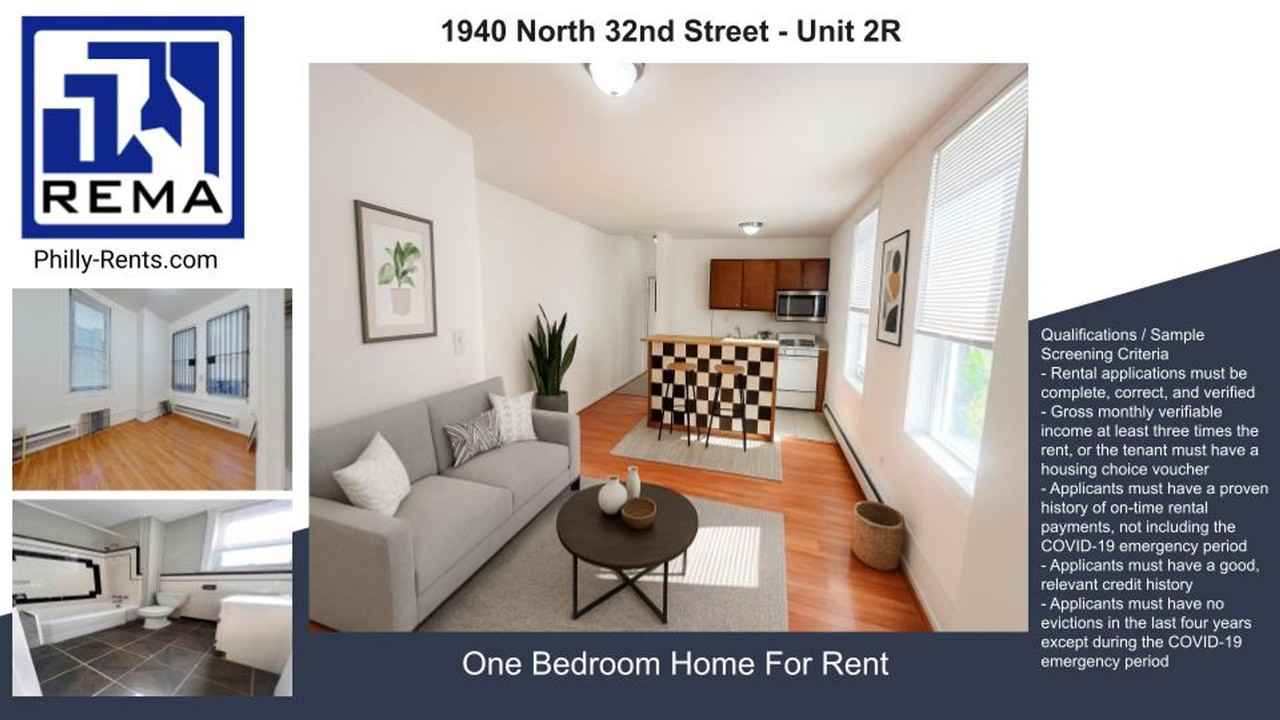 VIRTUAL TOUR https my matterport com show ?m=zdDDn5tSvqh 1 King-Sized Bedroom/Living Space 1 Full Bathroom with Tub Classic Philadelphia Interior Newly Painted Stove, Microwave & Refrigerator Included! Closet Professionally managed with resident portal, mobile app, and electronic rent payments available. Move-in Ready! Three months’ rent to move in (including first, last, and security deposit) along with successful screening results. Successful applicants should have: - no evictions - no recent repossession - no foreclosure - no bankruptcy - no large amounts of money in collections with utility companies - and also maintain decent payment history on other items and; - 3 times the rent and monthly, recurring income *** When applying, applicants MUST: •fill out the application and its entirety • Complete 2-Step Income Verification Which Includes: 1) Upload three recent paystub’s for each employer 2) Complete banking income verification form • AND upload a photo of your valid US ID Qualifications / Sample Screening Criteria - Rental applications must be complete, correct, and verified - Gross monthly verifiable income at least three times the rent, or the tenant must have a housing choice voucher - Applicants must have a proven history of on-time rental payments, not including the COVID-19 emergency period - Applicants must have a good, relevant credit history - Applicants must have no evictions in the last four years except during the COVID-19 emergency period "Although deemed accurate, this information is subject to errors, omissions, and changes without notice." Lease Terms: Needed at leasing signing: (1st months, last months & security) 3x Minimum monthly income (before taxes) needed to qualify: 3x rent $ Decent/good credit _______________________________________________ Real Estate Management Advisors, LLC - REMA Licensed Real Estate Broker Property Manager Servicing Commercial & Residential Properties in the Philadelphia area. Consumer Notice - Real Estate Management Advisors, LLC in an exclusive agent of the landlord. Not the one for you? Let’s find it together: https www reinfo411 com rentals We can be social too: https www facebook com REINFO411 YouTube Video URL