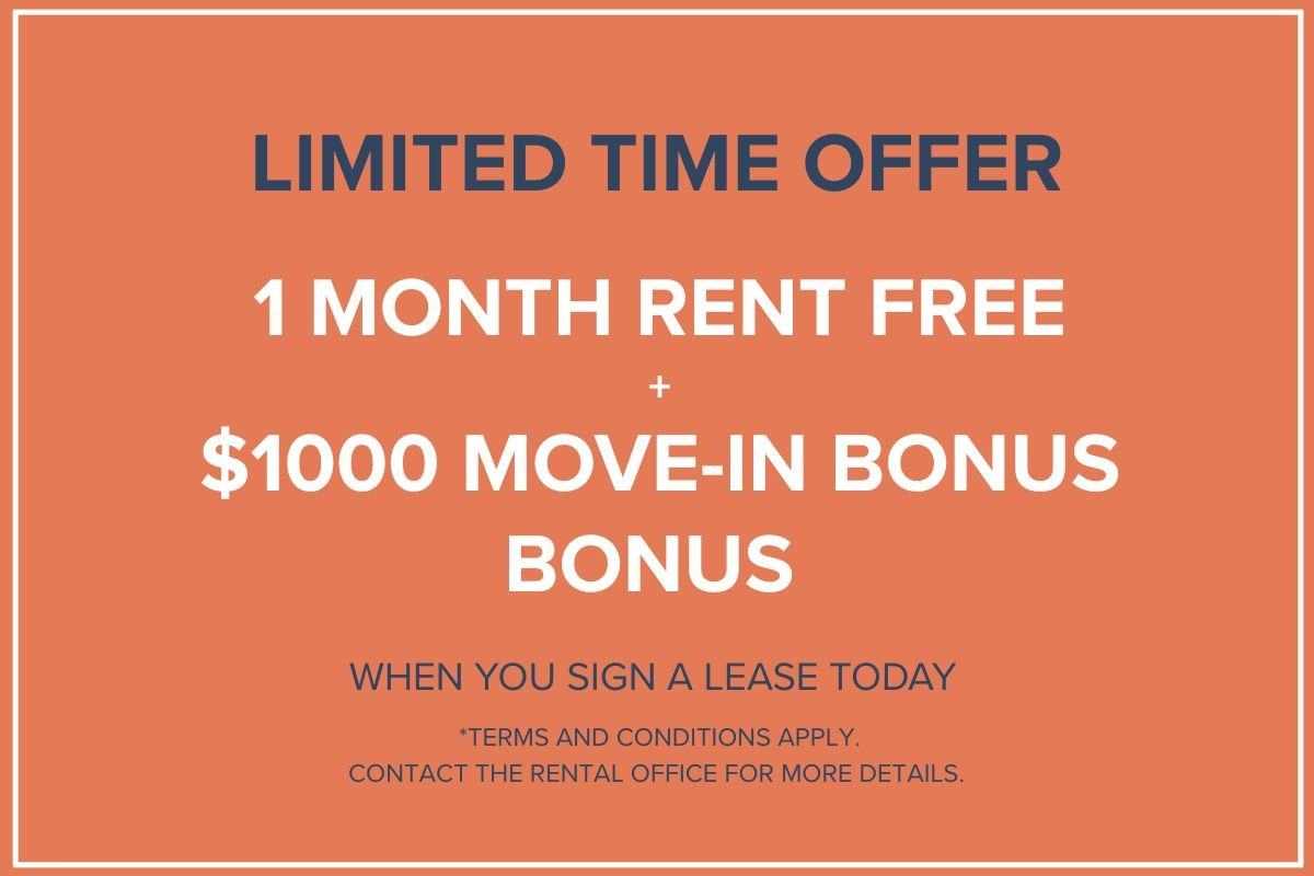 1 Month Rent Free + $1000 Move-In Bonus + $500 Security Deposit