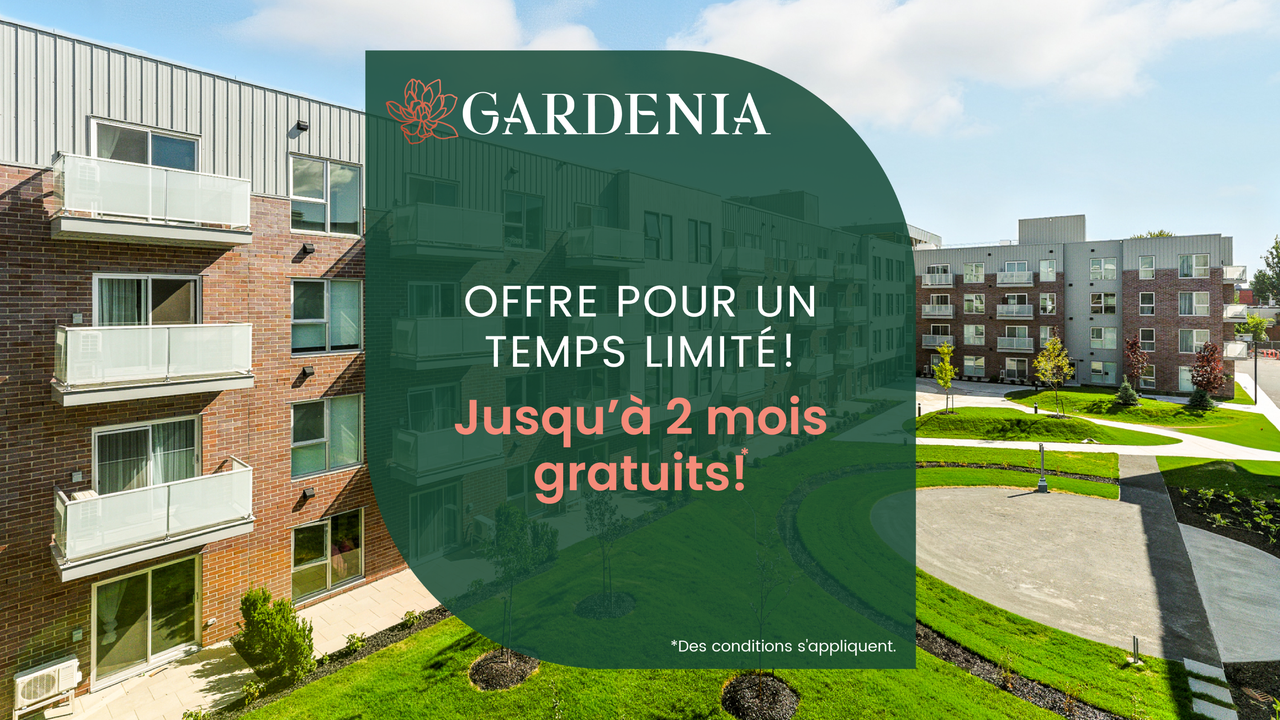 LIMITED-TIME PROMOTION: UP TO 2 MONTHS OF FREE RENT*. Gardenia - Green Urban LivingRental condos inspired by nature in the heart of Lachine Immediate occupancy Just 15 minutes from downtown Montreal, Gardenia is ideally located in the heart of a fast-developing neighbourhood. You will be delighted by the abundance of services, restaurants, and cafés that simplify your daily life and ensure your well-being. Make your home in a carefully curated community combining functionality, comfort and style. Every detail and common area has been thoughtfully created to offer a unique and inspiring living experience. - Inviting lobbies in each building - Co-working spaces - Shared lounges - Kitchen for private events - Indoor parking - Six appliances are included in every unit - Private terrace with BBQ for private events - Shared rooftop terrace - Kids’ play areas - Dog spa - And more A new way of living, where nature-inspired architecture and design create a warm and welcoming environment. With indoor and outdoor spaces focused on well-being, Gardenia promotes a healthy and active lifestyle designed in the spirit of community. Indulge in a variety of on-site amenities and activities, including: - Outdoor fitness space - Gym - Yoga zone - Urban vegetable garden - Walking trails - Landscaped interior courtyards - Outdoor relaxation areas - And more *Certain conditions apply. For a limited time only. Contact our rental agents for more information.