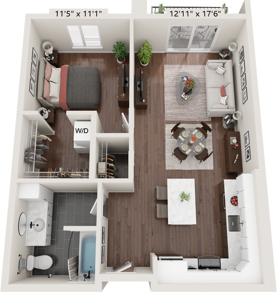 | One Bedroom 1B-3 | 1 bed | 1 bath | 929 sqft | $1,650 /mo | 1 unit available | This one-bedroom layout includes a versatile den that can be used as a home office, guest room, craft room, or gaming room. The modern kitchen features energy-efficient stainless-steel appliances, quartz countertops, and ample storage. The apartment also offers laminate wood flooring, contemporary fixtures, a stackable washer and dryer, window coverings, ceiling fans, a large closet, and a private outdoor balcony. | |