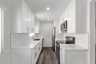 - Shaker white cabinets in kitchen and bathroom