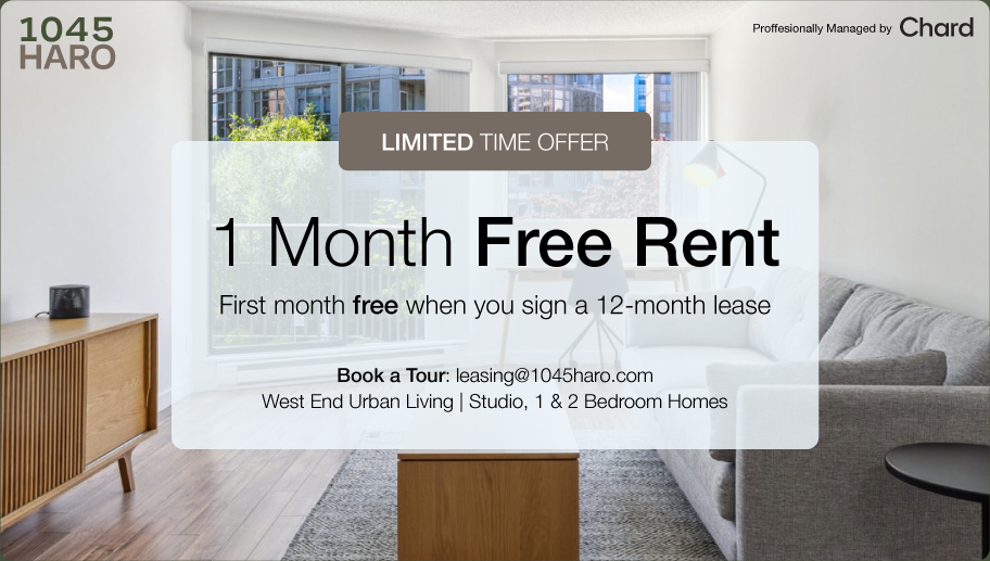 Book a Tour: **** Find your next home at 1045 Haro - a well maintained, professionally managed rental building in the heart of Downtown Vancouver and the West End. Located on a tree lined street conveniently located a short walk from the vibrant hubs of Robson and Granville and the Burrard and City Centre Skytrain stations, this location can’t be beat. Vancouver’s West End is a vibrant, diverse neighborhood nestled between the bustling downtown core and the natural beauty of English Bay. Known for its scenic, tree-lined streets and laid-back atmosphere, the area offers a unique balance of urban amenities and outdoor escapes. Residents are steps away from iconic green spaces like Stanley Park and English Bay, where they can enjoy beaches, trails, and views across the water. The West End is a community-centric area with eclectic shops, cafes, and restaurants lining Davie, Robson, and Denman Streets, providing a blend of local charm and city energy. The West End’s location in Downtown Vancouver enhances its appeal, providing easy access to the city’s main business and entertainment districts. Cultural landmarks, like the Vancouver Art Gallery and Robson Square, are just a short walk away. The nearby Burrard and Vancouver City Centre Skytrain stations make commuting seamless, while the surrounding parks and waterfronts offer countless options for outdoor activities, from kayaking to jogging along the seawall. With its blend of nature, community, and accessibility, the West End is truly one of Vancouver’s most desirable neighborhoods.