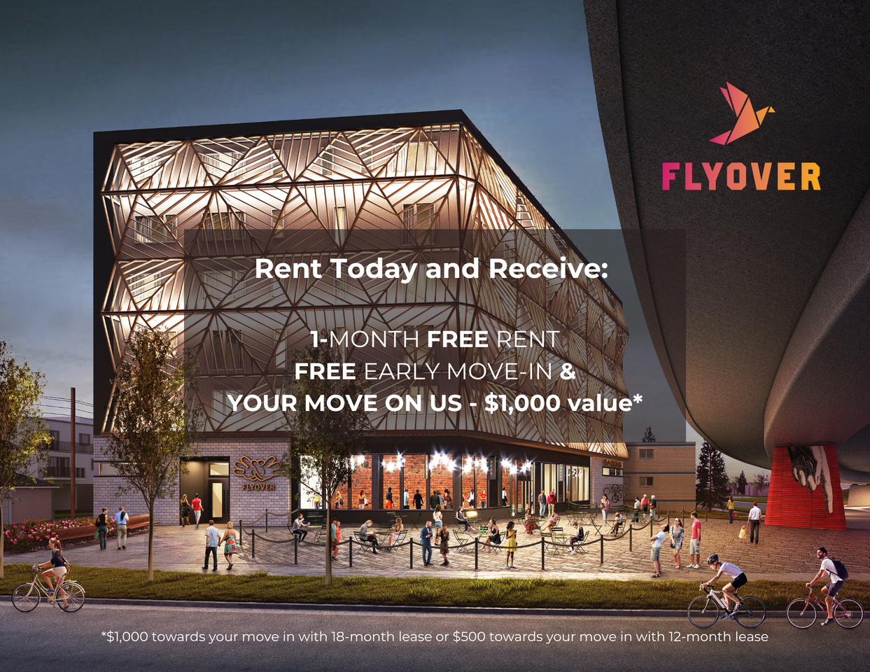 Discover the reasons to live at Flyover - Units starting from $1,199/month!! Now with our exclusive tenant coffee room and Flyover360 Sky Lounge open. [CLICK HERE TO BOOK YOUR TOUR TODAY!!](https calendly com ecliving flyover-showing) or paste this URL into your browser: https calendly com ecliving flyover-showing Incentive Summary: (1) one month free rent, (2) free early move-in and (3) your move-in on us - a $1,000 value*!! Book a tour today with our Leasing Team by registering at [rentflyover.ca](https://www.rentflyover.ca) *NEW WINTER INCENTIVE: $1,000 towards your move in with 18-month lease OR $500 towards your move in with 12-month lease - only eligible for select units! Contact our leasing team for more detials, including the opportunity to to convert a portion of this to a new furniture credit*. Located steps away from downtown, Flyover embodies Bridgeland-living at its finest. With close proximity to East Village, the Bow River and the city’s internationally-acclaimed Flyover Park, Flyover is more than just a building. It’s the perfect hub for your daily activities, the ideal basecamp for your busy life. Flyover is only minutes away from the best restaurants, cafes and night life Calgary has to offer. From the ultra-modern aesthetic to the iconic 50-foot artist’s mural that adorns it, Flyover is redefining how it feels to live and work in the heart of the city. Choose Flyover, and you’re choosing a property you’ll be proud to call home. Flyover offers cutting-edge amenities and stylish one-bedroom and studio rental residences that harmonize convenience without compromise. Elevate your lifestyle with these amazing building and location features: - Flyover360 Sky Lounge: 3,500 square foot outdoor lounge with breathtaking view of downtown Calgary and games area - TENANT EXCLUSIVE COFFEE ROOM: did someone say free coffee? Enjoy a latte on us anytime you want! - Bike-Friendly: with ample bike stalls on site, enjoy easy commuting and daily rides along the Bow River - Peace of Mind: State-of-the-Art Security System with over 25 security cameras for your Safety and Visitor Access Control via Building App - Convenience: Parcel & Package Management - Prime Location: At the nexus of Bridgeland, East Village, Downtown, and The Bow River - Enhanced Experience: 50-Foot Artists Mural representing the Building and Surrounding Environment - Unique Nest-Inspired Exterior Architectural Screen - Get Active: Proximity to Bow River Walking, Running, and Biking Paths - Across the Street: Marble Slab Creamery and Blush Lane Market. - Next Door: The World-Famous, Award-Winning Flyover Park - Vibrant Local Area: Surrounded by an array of dining options including Restaurants, Breweries, Distilleries, Bars, Coffee Shops, and more At Flyover, we’re committed to exceptional interior design. Our units maximize available space, resulting in a collection of residencies that don’t compromise on style or convenience: - Quartz Countertops with Stainless Steel Sink - Stainless Steel Energy Star Certified Appliances - Luxury Vinyl Plank Flooring - In-Suite Laundry - Air Conditioning Included - Cozy In-floor Heating - Choice of Two Colour Palettes - Downtown City Views (select suites) - 9-foot Ceilings - Smart Home Features like Keyless Entry and Samsung SmartThings Fridge & Range - Energy Efficient Vinyl Double Pane Windows - Roller Shade Window Coverings throughout with Blackout Shades in Bedrooms - Buil..