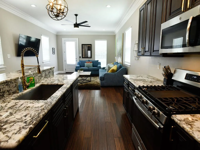 | 1824 Onzaga Street - A | 3 bed | 2 bath | 1,450 sqft | This FULLY FURNISHED 3 bedroom 2 bath Creole Cottage is nestled in the heart of New Orleans just adjacent to the historic Treme neighborhood and along the St. Bernard Ave Corridor. Live among the locals and be just minutes away from New Orleans' CBD, the French Quarter, City Park and the Fairgrounds where all of the major festivals are held. Tastefully decorated, this unit boasts ALL NEW furnishings including King and Queen sized beds with Sofa Sleeper. Stainless appliances and magnificent granite counters adorn the kitchen with other special touches to make it feel like home. Highlighted by an Open Floor Plan with 10' ceilings and beautiful recessed lighting throughout, this home features other amenities such as a glass enclosed shower in its master en suite, on site washer and dryer, a rear fenced in yard along with off-street parking. |