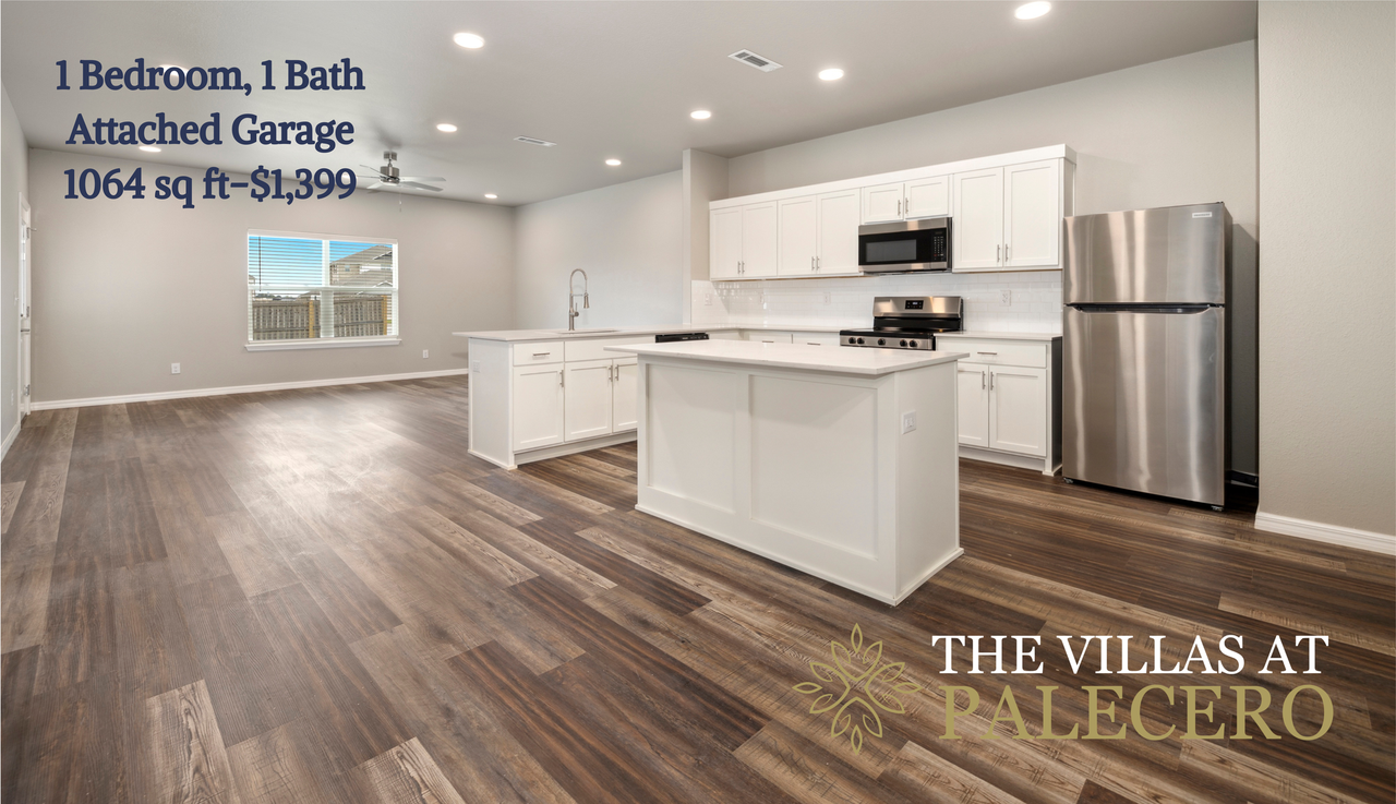 | 1/1.00 | 1 bed | 1 bath | 1,064 sqft | $1,399 /mo | 14 units available | Welcome to The Villas at Palecero in Tontitown — a brand new community designed to feel like home. Our 1-bedroom villas offer an ideal blend of comfort and convenience. Residents enjoy amenities like a fitness center, community room, outdoor patio with gas grills, fireplace, and fire pits, plus a pet park, pet wash station, and walking trails. Inside, the villa features quartz countertops, stainless steel appliances, designer lighting and hardware, vinyl plank flooring, a spacious walk-in shower, an attached garage, and front and back patios — all thoughtfully designed. Our 1-bedroom villas feature a spacious open layout that you have to see to believe | |