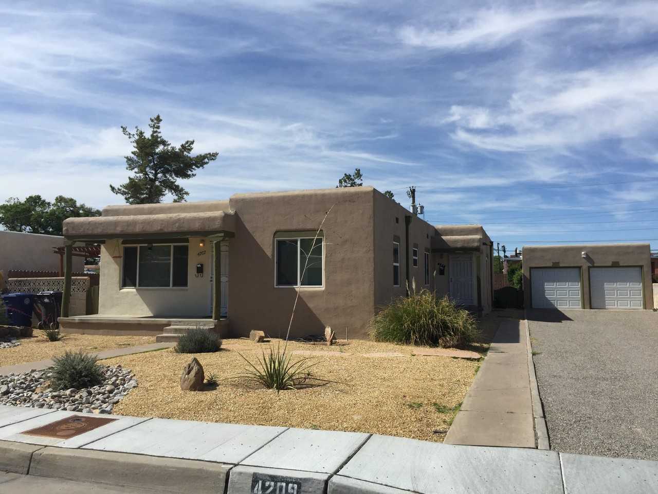 | Albuquerque, NM - Duplex - $1,450.00 Available February 2025 | 2 bed | 1 bath | 850 sqft | The rare Updated and Loaded, Quality Nob Hill 2 Bedroom. Located on one of North Nob Hill's best blocks! Large two bedroom end unit in a charming duplex nestled in a quiet neighborhood just steps from Humble Coffee, shopping, Nob Hill flavor, and easy Interstate access. Beautiful hardwood floors and great period details, along with modern appliances and nice updates. Light floods the large eat-in kitchen and full bath, and two generously sized rooms with oversized closets. Master bedroom features his and hers closets. Huge Eat-in kitchen offers a gas stove, custom tile backsplash, abundant cabinetry, and yards of countertop space. Well designed and well maintained. Nicely landscaped outdoor spaces, including a covered back patio with metal roof pergoal. The private walled backyard connects the house to the 1-car garage, with plenty of off-street parking. Stacked washer & dryer included. |