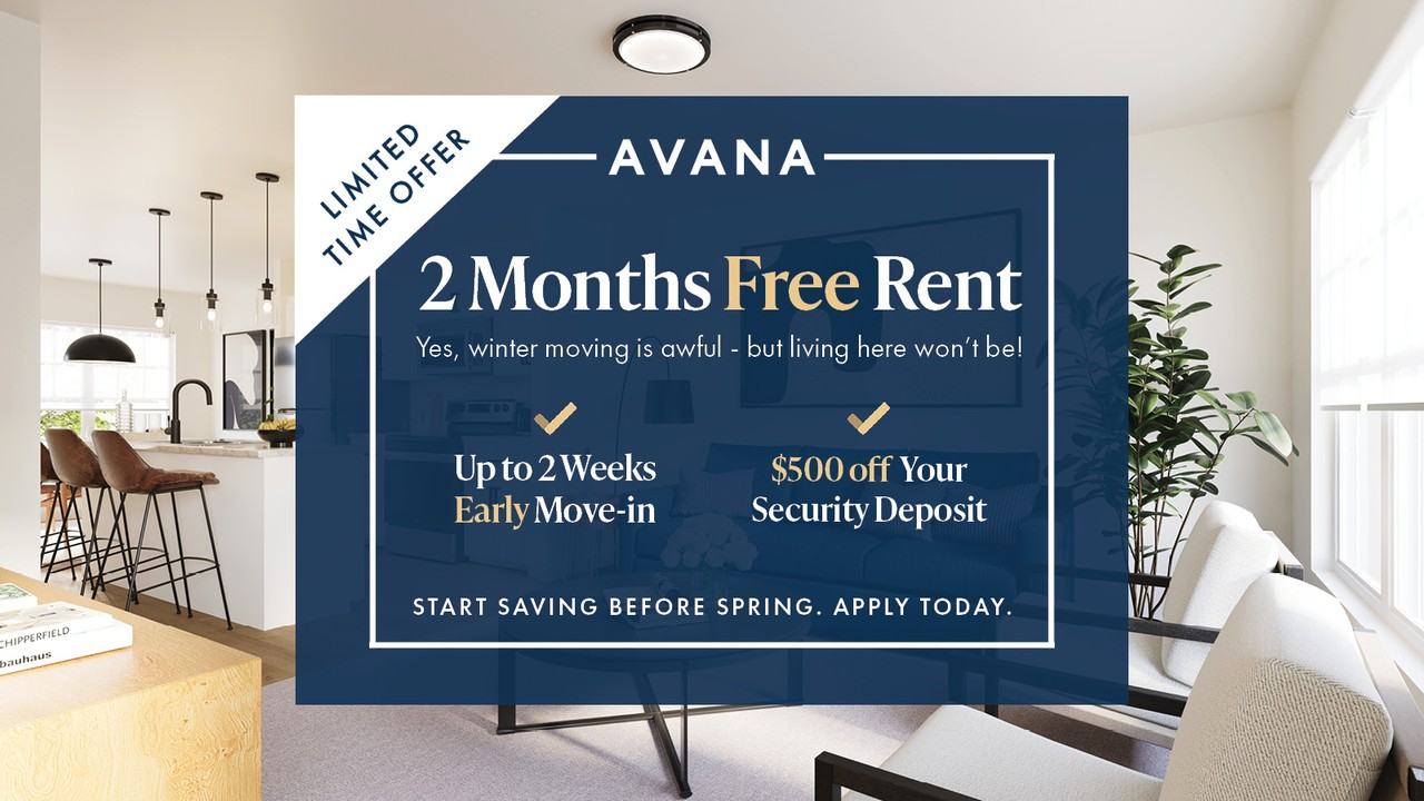 2 Months Free Rent - Up to 2 Weeks Early Move-In - $500 off Security Deposit Make your winter move easier (and way more affordable). For a limited time, winter move-ins receive 2 months FREE rent, the chance to move in up to 2 weeks early, and 50% off the security deposit.