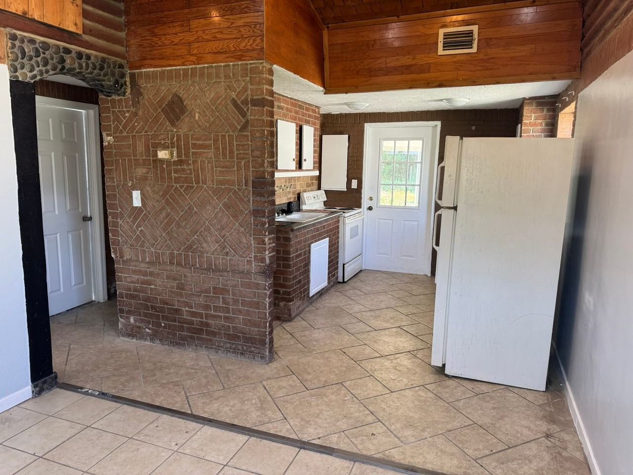 - Wood and brick accents throughout