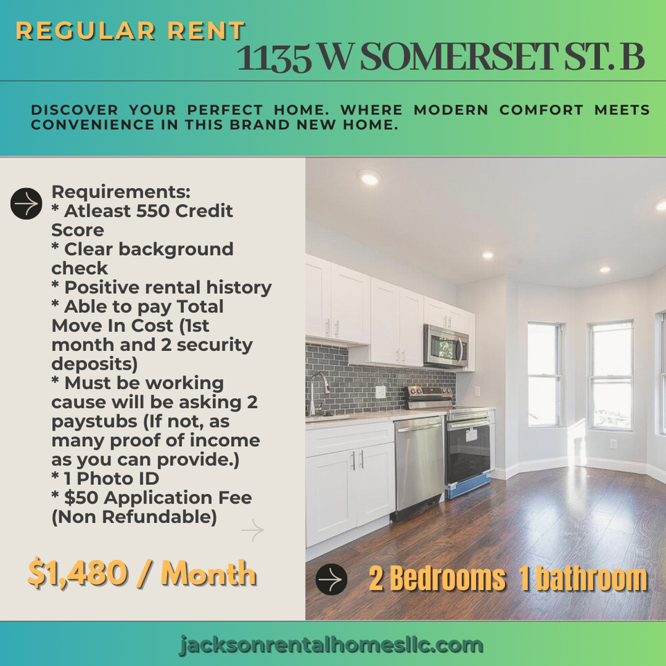Welcome to 1135 W Somerset St. B, a newly renovated 2-bedroom, 1-bathroom apartment that offers the perfect balance of modern design, comfort, and convenience—all for just $1,480/month. Ideal for individuals, couples, or small families, this beautiful apartment is move-in ready and full of thoughtful touches that make it feel like home. Step inside to stunning hardwood floors and abundant natural light that pours through large windows, creating a bright and inviting atmosphere. The open-concept kitchen is a standout feature, equipped with stainless steel appliances, a dishwasher, sleek white cabinetry, silver fixtures, and a contemporary backsplash that ties everything together. Recessed lighting enhances the clean, modern vibe throughout the space. Both bedrooms are generously sized, perfect for rest, work, or creativity. The updated tiled bathroom includes a stylish LED mirror, adding a touch of luxury to your daily routine. You'll also love the in-unit washer and dryer, giving you the ease and independence of doing laundry from the comfort of your own home. Located near Mastery Charter School Clymer Elementary and just minutes from 12th & Cambria Recreation Center, this apartment offers a great location with easy access to schools, parks, and public transportation. Whether you're upgrading your space or starting fresh, 1135 W Somerset St. B has everything you need in a home. Don't miss this opportunity—schedule your tour today and discover what modern city living should feel like! $1,480/Month Requirements * Atleast 550 Credit Score * Clear background check * Positive rental history * Able to pay Total Move In Cost (1st month and 2 security deposits) * Must be working cause will be asking 4 or 2 paystubs (If not, as many proof of income as you can provide.) * 1 Photo ID * $50 Application Fee (Non Refundable)