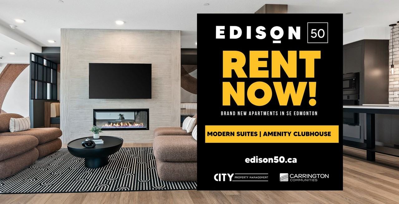 Special promotions on select suites up to $175/month!! New Units Just Released! Rent brand new, modern apartments in southeast Edmonton! Edison 50 brings you modern apartments brought to life through fresh design, stylish interiors, and a connected community. Edison 50 offers a robust amenity clubhouse for tenant enjoyment, including a welcoming lobby with a built-in Gourmet Coffee Bar, two-story Fitness Centre, fully equipped Social Lounge with restaurant-style seating, a Games Room set up for bring-your-own-console gaming, and a bright breezeway suitable for work or quiet reflection. 1 bedroom + 1 bathroom start at $1,475/month; 2 bedroom + 2 bathroom start at $1,685/month; Includes heat & water! Suite Features: - Attractive, professionally designed interior finishing packages in each suite - Air Conditioning and individually controlled heating in each suite - IN-SUITE laundry - Stainless steel appliances includes a dishwasher - Designer cabinets - Quartz countertops throughout - Luxury Vinyl Plank flooring - Designer lighting and blind package - Oversized patio doors - TELUS promotions available Building Features: - Air-conditioned Fitness Centre and Yoga Mezzazine - Social Lounge fully equipped with a kitchenette, seating and TV - Outdoor Patio featuring a gas fireplace, covered gazebo, lounge seating, turf area, and garden boxes - State-of-the-art Games Room with arcade, billiards, and lounge seating - Pet Wash - On-floor storage available - Secured underground parking available - Convenient Visitor Parking - Elevator service to all floors - Secured keyless entrance with the ability to control visitor access from your phone - Video surveillance throughout for additional security - SMART parcel delivery centre CONTACT US to view our selection. *Prices, incentives, availability, and specifications are subject to change. May not be available in all suites Images may not reflect actual suite finishes. E. & O.E.