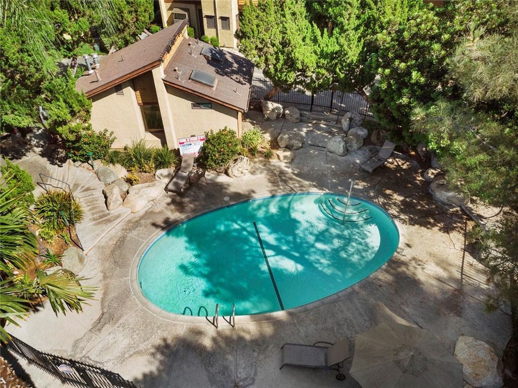 Welcome to this spacious and beautifully updated 1-bedroom, 1-bath condo featuring a large living room with soaring cathedral ceilings, recessed lighting, a cozy fireplace, and newer laminate flooring?perfect for relaxing or entertaining. The modern kitchen offers quartz countertops, white shaker cabinets, stainless steel appliances, and a gas stove, with a clear view of both the living room and the serene backyard. Upstairs, the loft-style primary bedroom overlooks the living space and features a walk-in closet and an updated en-suite bath with quartz countertops and stylish lighting. Additional features include: Central A/C & heating In-unit laundry (enclosed off the patio) Private patio with peaceful views of water streams & mature trees 2-car parking Move-in ready condition Located in a beautifully maintained community with 4 pools, tennis courts, and scenic walking paths. Conveniently close to freeways, shopping, restaurants, and more!FIRST MONTH FREE.