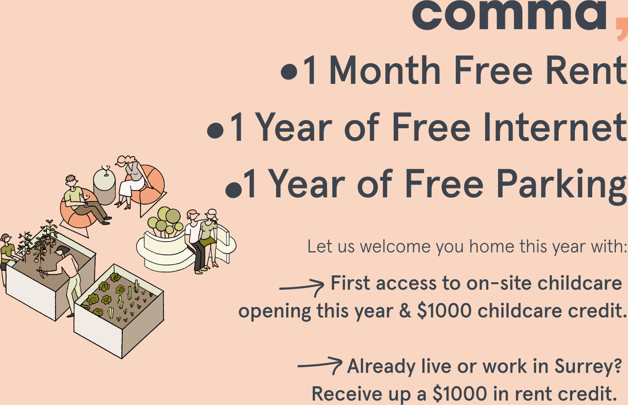 1 Month Free + 1 Year Free Internet & Parking Move in today to receive 1 month free rent, 1 year of free parking and 1 year of free internet*. Let us welcome you home this year with: - First access to childcare opening this year & $1000 childcare credit.* - Already live or work in Surrey? Receive up to $1000 in rent credit.* Boo