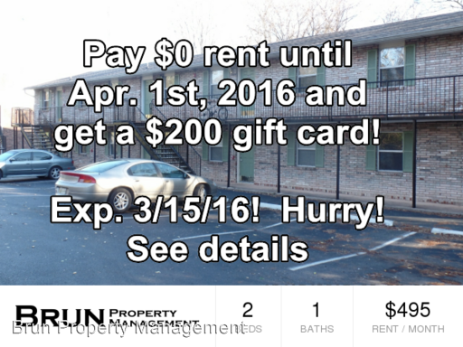 (RLNE1837008) $0 rent until 4/1/16 & $200 gift card! Exp 3/15/16! Hurry! See details These are our March 2016 move in incentives (they expire 3/15/16): No FICO score at all: you get a $200 gift card. 500 to 599 FICO: you get a $300 gift card. 600 to 649 FICO: pay $0 rent until 4/1/16. 650 to 699 FICO: pay $0 rent until 4/1/16 + $200 gift card. 700 to 749 FICO: pay $0 rent until 4/1/16 + $200 gift card + 1/2 off 1st month of renewal. 750 to 900 FICO: pay $0 rent until 4/1/16 + $200 gift card + 1st month of renewal free. Please calls us or visit our website for all qualifications, terms and conditions. www.brunpm.com.