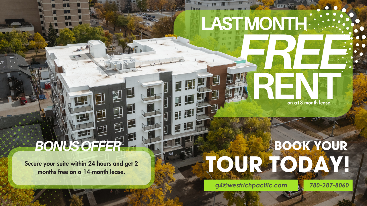 NOW LEASING — LIMITED UNITS REMAINING Be the first to live in Edmonton’s newest luxury rental community at G4! You can view floor plans here: [https g4 westrichrentals com floorplans ](https g4 westrichrentals com floorplans ) To view unit finishings, please review our gallery: [https g4 westrichrentals com floorplans #gallery](https g4 westrichrentals com floorplans #gallery) Elevated Living at G4 – Modern Comfort Meets Urban Convenience Each brand-new suite at G4 includes - In-suite laundry - All units have A/C - Private balconies with oversized windows for maximum natural light - Designer kitchens with quartz countertops & stainless-steel appliances - Luxury vinyl plank flooring – no carpet - Roller blinds, including blackout in all bedrooms Thoughtfully Designed Amenities Include: - Heated underground parking (with available storage lockers) - Lobby Espresso Bar - Secure bike storage and smart parcel lockers - High-speed elevators and monitored security - Pet-friendly (inquire for details) - On-site Leasing and Property Management - Responsive Maintenance Team - Professional, Resident-Focused Experience G4 Edmonton 10015 113 Street NW, Edmonton, AB (780) 287-8060 **** [g4.westrichrentals.com](https://g4.westrichrentals.com) Please note: Images may include virtual staging. Furniture not included.