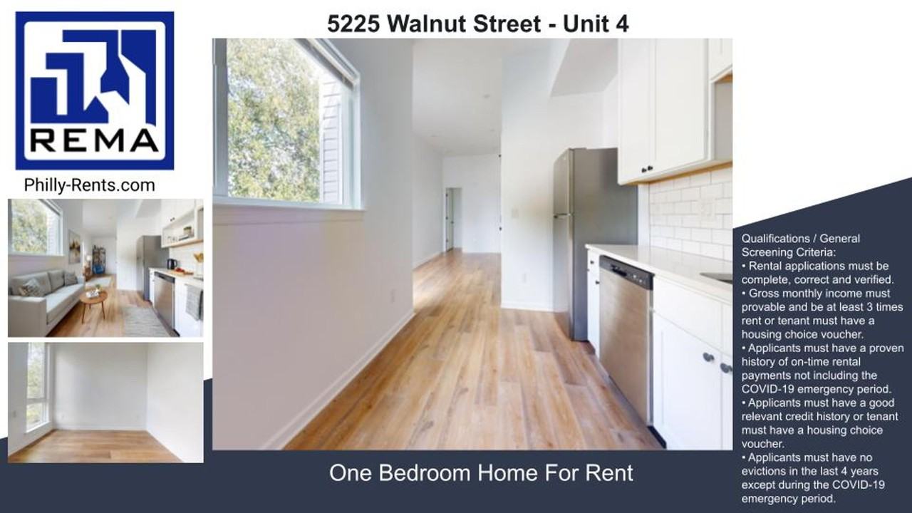 Virtual Tour: https my matterport com show ?m=CrQstvvE48u This apartment in Philadelphia's Walnut Hill area offers a thoughtful blend of compact living and modern amenities. The single-floor layout features one bedroom complemented by a full bathroom and an efficiently designed kitchen. The kitchen stands out with its contemporary aesthetic, showcasing white cabinetry, subway tile backsplash, and stainless steel appliances. A sleek black faucet adds a touch of contrast to the predominantly white palette. The kitchen is equipped with essential appliances, including a dishwasher, microwave, and range, catering to everyday culinary needs. Throughout the apartment, warm-toned hardwood floors create a cohesive and inviting ambiance. The living area, while compact, benefits from an open-concept design that seamlessly connects to the kitchen, enhancing the sense of space. Large windows allow ample natural light to flood the interior, offering views of the surrounding greenery and contributing to a bright, airy atmosphere. The bathroom continues the modern theme with a white vanity, black fixtures, and a well-lit mirror. Despite its compact size, the apartment makes efficient use of space, with thoughtful storage solutions evident in the kitchen and likely throughout the rest of the home. Located at 5227 Walnut St, this apartment combines urban convenience with a cozy, contemporary living space, ideal for those seeking a stylish yet efficient home in Philadelphia. Qualifications / General Screening Criteria: • Rental applications must be complete, correct and verified. • Gross monthly income must provable and be at least 3 times rent or tenant must have a housing choice voucher. • Applicants must have a proven history of on-time rental payments not including the COVID-19 emergency period. • Applicants must have a good relevant credit history or tenant must have a housing choice voucher. • Applicants must have no evictions in the last 4 years except during the COVID-19 emergency period.