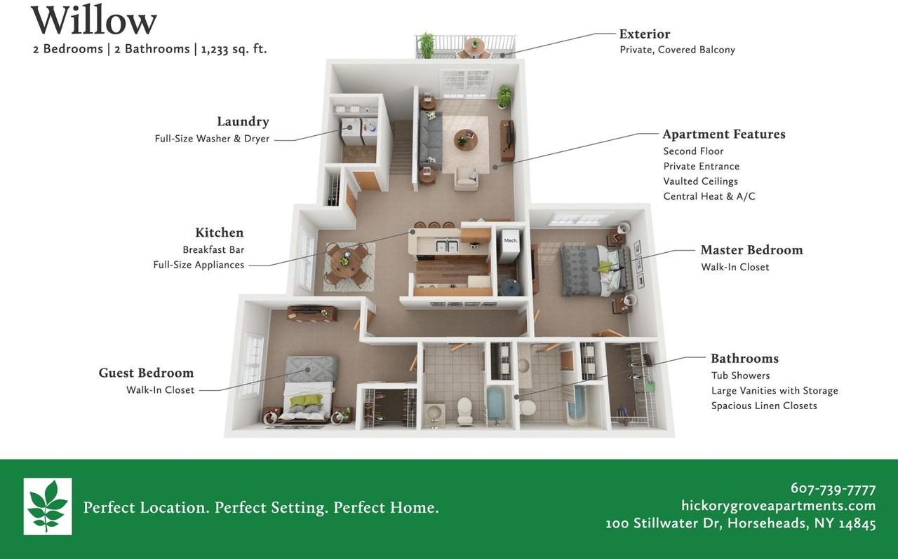 | Willow | 2 bed | 2 bath | 1,233 sqft | $1,732–$2,051 /mo | 6 units available | The Willow features a quaint kitchen with a breakfast bar and all appliances, including a dishwasher and garbage disposal. The master bedroom includes a large walk-in closet and en-suite bathroom with double vanity, tiled flooring & tub surround, and a linen closet. The spacious guest bedroom has an attached bathroom with a vanity, tile surround, and a linen closet. The living area opens up to vaulted ceilings with a ceiling fan and access to a private, covered balcony. |
