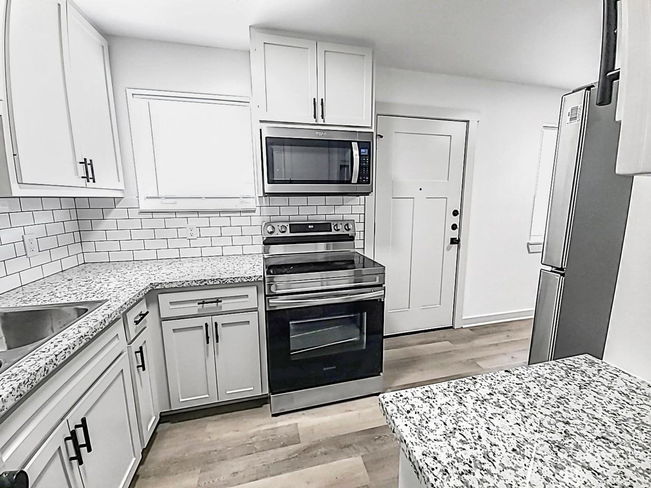 Two Bedroom One Bath Townhome with designer finishes throughout. Granite countertops with stainless steel appliances and black hardware with separate breakfast area in kitchen. Granite countertops with black hardware and faux marble tile in bathroom. Light grey wood floors in living room and bedrooms, large front loading high efficiency washer and dryer ( $60) , built in shelving, linen closet and modern finishes throughout.