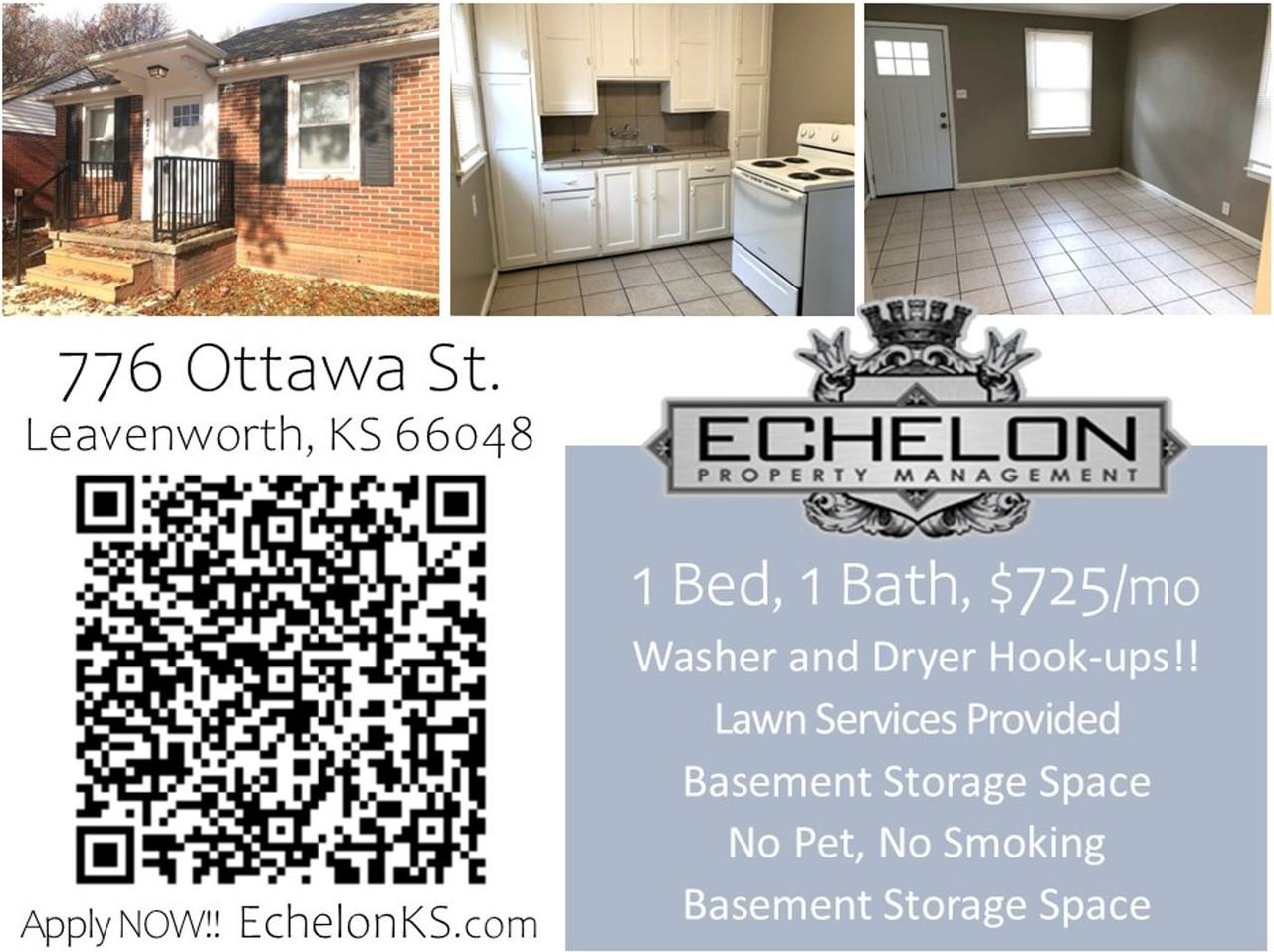 One Bed, 1 Bath Duplex on a tree-lined street!! Minutes away from Historic Downtown Leavenworth, Fort Leavenworth, Lansing, University of Saint Mary, and the Greater Kansas City Area!! Tile Floors!! Basement has Washer and Dryer hook-ups and plenty of storage space!! Lawn Care PROVIDED for your convenience. No Pet. No Smoking. Showing Properties for Applicants Only. Apply NOW!! EchelonKS. com Professionally managed by Echelon Property Management, 913-705-0201. Rental qualifications: Credit score of at least 600, no evictions within the past 7 years, at least 90 days verifiable income, monthly income of at least 3 times the rent, at least 18 years of age.