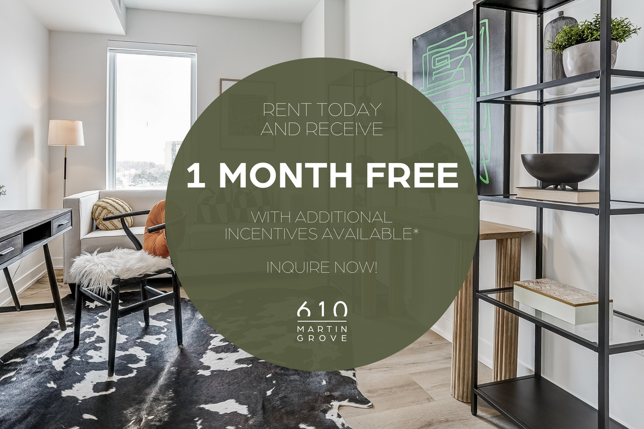 For a limited time only, enjoy 1 month of free rent, plus additional incentives available - inquire today!* *Select suites only. Terms and conditions apply. Prices and specifications subject to change without notice. E&OE. [RSVP to our open house on March 27th, 3 - 7 PM.](https www mintoapartments com gta Etobicoke-apartment-rentals 610-Martin-Grove Event-NL~3115 html?utm_medium=referral&utm_source=rentsync-profile&utm_campaign=referral-rentsync-profile-gta-610-martin-grove&utm_content=open-house-2026) Now leasing at 610 Martin Grove – stylish, brand new apartments in Etobicoke! Step into a refreshed lifestyle with our one-bedroom, one-plus-den, two-bedroom, and two-plus-den suites, thoughtfully designed for modern living. Suite Features: - Open-concept layouts with luxury vinyl flooring and expansive windows - Quartz countertops and ceramic backsplash - Kitchen island and four stainless steel appliances - Convenient in-suite laundry - Private balcony with scenic views (select suites only) - Roller blinds and blackout bedroom blinds - Central A/C for year-round comfort Premium Amenities: - State-of-the-art fitness centre - Resident lounge and party room with full kitchen - Multiple coworking spaces and Zoom rooms - Pet spa - Community garden & outdoor grilling stations - Secure parcel room - Underground and visitor parking - Communauto car share on-site - Smoke-free building with secure fob access Nestled in the vibrant Richview, Etobicoke neighbourhood, you’ll enjoy easy access to parks, walking trails, local shops, transit, and everyday essentials. Whether you’re relocating, downsizing, or starting fresh, 610 Martin Grove offers a welcoming community and a lifestyle that fits your next chapter. Embrace the ease of connected living at 610 Martin Grove. Inquire today to be among the first to call it home!