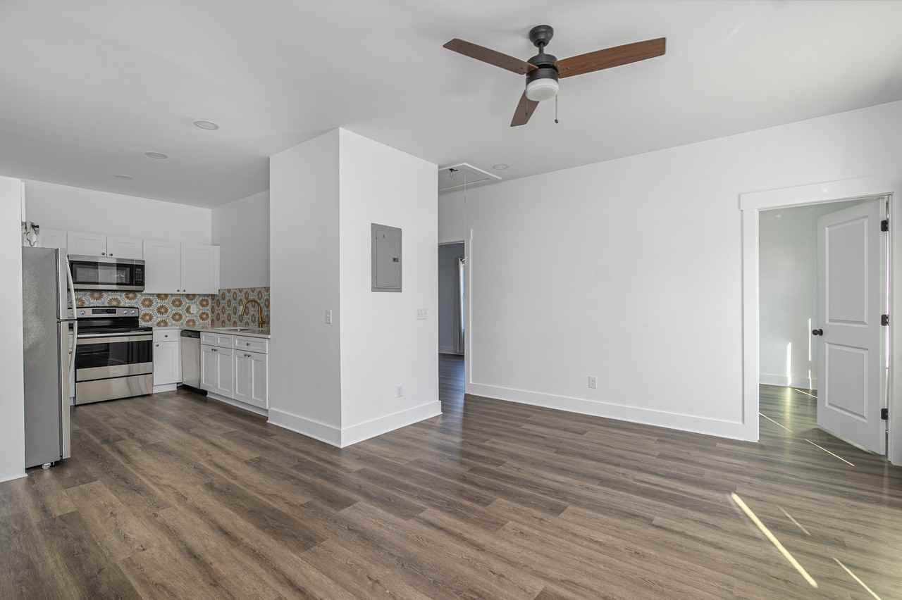 | 637 East Anderson Street - D | 2 bed | 1 bath | 850 sqft | $1,850 /mo | Stunning remodel! This 2 bed 1 bath ground floor apartment is bright, spacious, and perfectly located just east of Starland and downtown Savannah. The bright great room features a custom wall papered accent wall, included and mounted TV in the living area, open kitchen with beautiful and clean looking backsplash and fixtures. Plenty of room for living area, dining area for 4-6, and generous storage in the kitchen. The primary bedroom features high-ceilings, spacious closet, adjacent to the in-unit washer and dryer, and the fill bathroom with custom tile and fixtures. The secondary bedroom is just off the living area and would be perfect for an at home office or guest room. The bedrooms comfortably fit queen beds with side tables and a dresser. Each bedroom also includes flat screen TVs that are wall-mounted! There is off-street parking included in the rent and the property has regular landscaping maintenance to keep it looking sharp. |