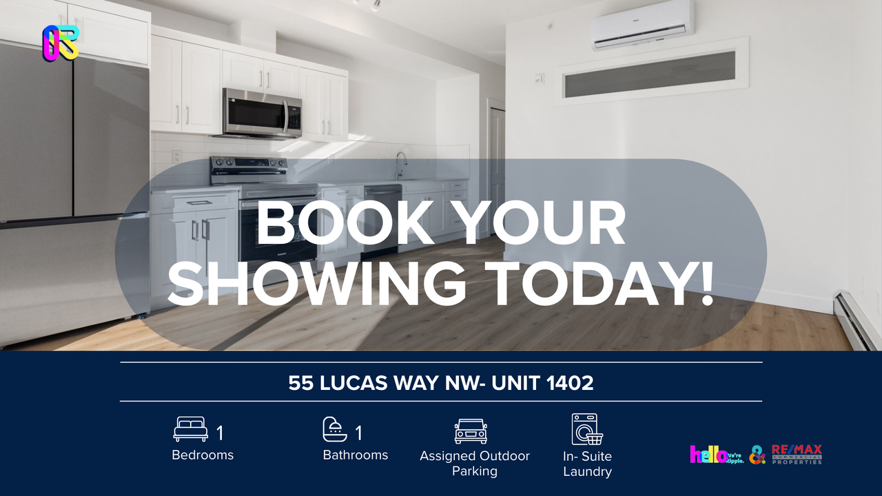 AMAZING 1 BED, 1 BATH CONDO | NO PETS ALLOWED Welcome to your next home! This beautifully maintained 55 Lucas Way NW - Unit 1402 offers the perfect blend of comfort, style, and convenience. Situated in the community of Livingston, Located just a short walk from the building, this massive recreation center is the social and active heart of the community, offering a level of amenity access rarely found in standard condo developments, this unit is ideal for anyone looking for a clean, modern, move-in ready space. SHOWINGS: Open-house format — book today! Prices, availability, and promotions subject to change without notice. Features: - Furnished or Unfurnished: Unfurnished - Utilities Included: Natural Gas & Water - Pets: No Pets Allowed - Smoking: Non-Smoking - Parking: Assigned Outdoor - Storage Included: Yes - Laundry: In- Suite Laundry - Management Type: Full Management - Lease Term: Long Term Why You'll Love It: - Architectural Airiness: The living area boasts soaring high ceilings and expansive oversized windows, flooding the entire space with an abundance of natural light. - Gourmet Chef's Kitchen: An open-concept culinary space featuring sleek stainless steel appliances, a convenient walk-in pantry for extra storage, and a double undermount sink. - Social Centerpiece: A large flush kitchen island provides the perfect spot for casual dining, morning coffee, or entertaining guests. - Dedicated Dining Space: A versatile dining area situated perfectly between the kitchen and living room, ideal for formal dinners or a home office setup. - Serene Primary Suite: The spacious bedroom serves as a private retreat, complete with large windows that maintain the home's bright and open feel. - Ultimate Convenience: Enjoy the ease of in-suite laundry and a thoughtfully designed layout that maximizes every square foot of living space. - Outdoor Living: Step out onto your private balcony (featuring a gas line) to enjoy the fresh air and community views.? Location Perks: - Steps from "The Hub": Exclusive access to Livingston's 35,000 sq. ft. HOA facility, featuring a gymnasium, splash park, tennis courts, and three skating rinks. - Livingston West Ponds: Situated directly alongside beautiful environmental reserve ponds with fountains and a scenic pathway system for walking or jogging. - Retail Convenience: Only a 2-minute drive to Carrington Plaza, featuring No Frills grocery, Shell, McDonald's, and various local dining options. - Commuter's Dream: Immediate access to Stoney Trail and Deerfoot Trail, placing you only 15 minutes from the Calgary International Airport and 20 minutes from Downtown. - Outdoor Adventure: Surrounded by 250 acres of open space, including 17 nearby playgrounds, a pump track, and a dedicated off-leash dog park. - Future Growth: Located near the future terminus of the LRT Green Line, ensuring long-term connectivity and potential value appreciation. - Quiet Urban Retreat: Positioned in a quieter low-rise complex that balances urban vibrancy with the peace of a nature-adjacent setting. Book your viewing today — this one won't last.