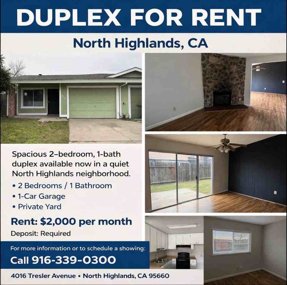 Duplex for Rent – North Highlands, CA Spacious 2-bedroom, 1-bath duplex available now in a quiet North Highlands neighborhood. Features include: 2 Bedrooms / 1 Bathroom, 1-Car Garage, Private Yard Rent: $1,950 per month, plus utilities Deposit: Required For more information or to schedule a showing: Call 916-339-0300 4016 Tresler Avenue North Highlands, CA 95660