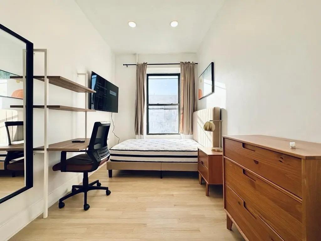 This private Queen room in 5 bedrooms 3 bathroms apartment, located in Clinton Hill is available on a flexible 1-18 month lease. Bedford Ave – #440 w/ Private Bathroom - Bright bedroom with high ceiling in prime Clinton Hill / Prime Bedstuy, right on Bedford Ave and Halsey St (1 block from Franklin Ave). Room has a HD TV, dresser, desk, chair, Wifi, a large closet and private bathroom. - 5 min walk to A, C, S trains, 10 min to G trains, 19 min to Manhattan, 16 min walk to Prospect Park. Experience NYCs second best park. - Bedford Avenue and Franklin Avenue are walkers paradise, renowned for their hip eateries, mom-and-pop shops. We are looking for someone who is clean, responsible and has good energy. - Utilities are $180 per month. Washer / dryer in unit. - $40 for monthly cleaning - Restaurants, cafes, bars, salons are 1 - 3 minute walk, you are in the center of a popping neighborhood. - There is a one-time room cleaning and administration cost of $175