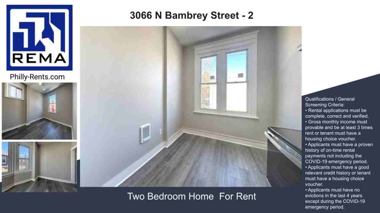 Virtual Tour: https my matterport com show ?m=JCWSkQ2o521 This 640-square-foot apartment, located at 3066 N Bambrey St in Philadelphia, offers a thoughtfully designed living space with three bedrooms and one bathroom. The layout maximizes functionality within its compact footprint, featuring a central hallway that connects all rooms efficiently. The primary bedroom, measuring 160 sq. ft., provides a spacious retreat within the unit. Throughout the apartment, sleek gray wood-look flooring creates a cohesive and contemporary aesthetic. The walls are painted in a neutral light gray, enhancing the sense of space and brightness. Large windows in the bedrooms allow ample natural light to flood the rooms, offering views of the surrounding neighborhood. The kitchen boasts modern dark cabinetry contrasting beautifully with light countertops. Stainless steel appliances, including a refrigerator, add a touch of sophistication. The bathroom features a clean, contemporary design with a white bathtub and modern fixtures. White trim and doors throughout the apartment provide a crisp, finished look. The overall design emphasizes a blend of style and practicality, making efficient use of every square foot to create a comfortable living environment in the heart of Philadelphia. Qualifications / General Screening Criteria: • Rental applications must be complete, correct and verified. • Gross monthly income must provable and be at least 3 times rent or tenant must have a housing choice voucher. • Applicants must have a proven history of on-time rental payments not including the COVID-19 emergency period. • Applicants must have a good relevant credit history or tenant must have a housing choice voucher. • Applicants must have no evictions in the last 4 years except during the COVID-19 emergency period. Consumer Notice - Real Estate Management Advisors, LLC in an exclusive agent of the landlord. Real Estate Management Advisors, LLC - REMA Licensed Real Estate Broker Property Manager Servicing Commercial & Residential Properties in the Philadelphia area. Check out more properties for rent at http www reinfo411 com residential-properties-for-rent Like us on facebook at https www facebook com REINFO411