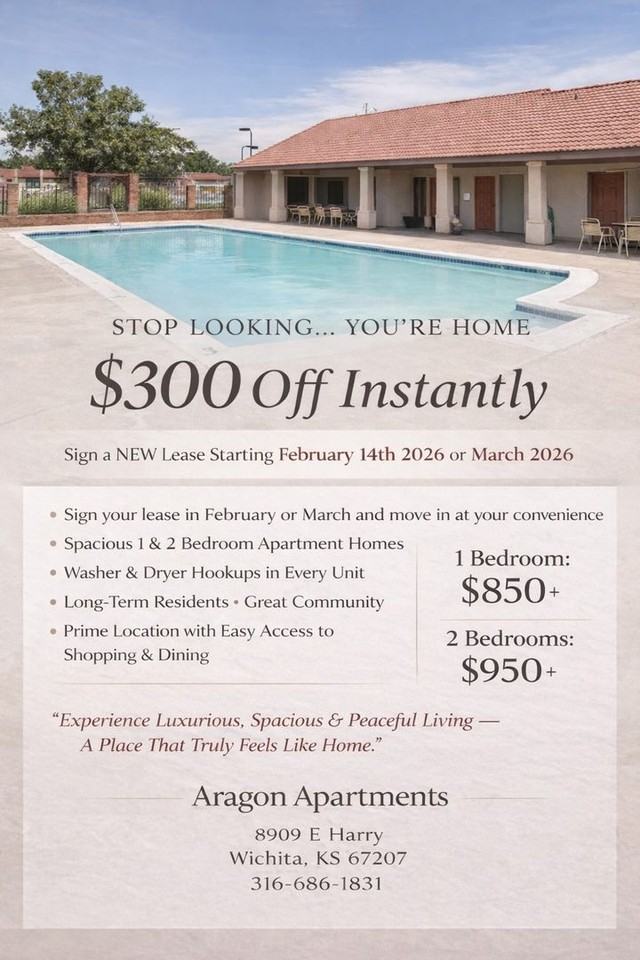 $300 New Lew Sign Up Offer - If you sign a new move in lease after February 14th 2026 or in March 2026. Welcome to Aragon Apartments, where contemporary design and superior comfort come together in the heart of Wichita, KS. Our community caters to those who seek a refined living experience with the convenience of urban amenities Each detail in our apartments is crafted to provide a lifestyle of luxury and relaxation, making Aragon Apartments more than just a place to live – it's a place you'll love to call home. Immerse yourself in a vibrant community that offers the perfect blend of sophistication and convenience, where every day feels like a getaway. Close to shopping, dining, highways, public transit, parks, healthcare, and top schools. Community Amenities: * Resort-Style Swimming Pool * State-of-the-Art Fitness Center * Stylish Clubhouse * Fully Equipped Business Center * Pet-Friendly with Dedicated Pet Park * Children's Playground * On-Site Maintenance * Secure Gated Community with 24-Hour Surveillance Apartment Features: * Modern Kitchens with Stainless Steel Appliances * Granite Countertops * Spacious Floor Plans * Private Balconies/Patios * In-Unit Washer and Dryer * Walk-In Closets * Elegant Hardwood Floors * Central Air Conditioning * High-Speed Internet Access Aragon Apartments stands out as a premier living destination in Wichita, offering an exceptional blend of style, comfort, and convenience. Schedule a tour today and see for yourself why Aragon Apartments is the epitome of modern living in Wichita.