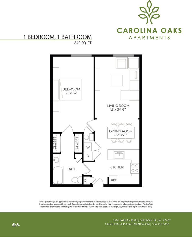 Settle into our inviting, one-bedroom apartment situated just a short distance from downtown Greensboro. Explore a variety of delightful dining options, from pub joints to breweries and seafood. Unique shops and art galleries are in the area, too! The apartment features a spacious, well-lit bedroom suitable for a king-size bed, a generously sized fully equipped kitchen, a sun-filled living room, and ample storage space. *All units are equipped with Washer/Dryer hookups. Carolina Oaks APARTMENTS, ITS OWNERS AND EMPLOYEES ADHERE TO FAIR HOUSING LAWS AND WILL NOT DISCRIMINATE AGAINST ANY PERSON ON THE BASIS OF RACE, COLOR, RELIGION, SEX, NATIONAL ORIGIN, DISABILITY OR FAMILIAL STATUS. QUALIFICATION FACTORS: 1) AGE - Age requirement for military personnel and all other applicants is 18. 2) INSURANCE- As a condition of our Apartment Lease Contract all residents are required to maintain a resident liability or property damage insurance policy in the amount of $100,000.00. 3) INCOME VERIFICATION- Proof of verifiable income must be submitted. Monthly gross income must equal or exceed 3 times the monthly rent. Acceptable forms of verification are: - A recent pay stub showing year-to-date earnings - Offer letter from employer - I-20 or Affidavit of Financial Support - W-2 form 4) COMPLETED RENTAL APPLICATION- If applicant does not have a social security number, the following documents must be provided: - Valid government-issued ID - Current Visa - Acceptance letter from the university if you are a student 5) Carolina Oaks Apartments evaluates each person applying to live at its community with a credit/background-risk scoring system that is provided by an independent consumer reporting agency and consistently applied to all of Carolina Oaks Apartments’ applicants. This scoring system uses a statistical model to estimate the credit risk that an applicant may not satisfactorily fulfill his/her lease obligations. The statistical model was developed from data regarding actual residents and their payment performance of their lease obligations. Prior to final acceptance of each applicant, Carolina Oaks Apartments will use this system to provide Carolina Oaks Apartments with a numerical score that represents a relative measure of the credit risk associated with that applicant. Each applicant’s credit/background-risk score will be compared to Carolina Oaks Apartments’ acceptance policies to determine whether or not the applicant may be accepted. If your application is rejected based on your credit/background-risk score, or accepted with certain additional conditions, you will be advised what factors most adversely affected your score and you will be given the name, address, and telephone number of the consumer reporting agency that provided the credit-risk score to Carolina Oaks Apartments. An applicant who is rejected based on his/her credit/background-risk score, or accepted with certain additional conditions, may obtain a copy of the consumer report(s) on which the credit/background risk score was based, and may initiate an investigation to have any erroneous information contained in such reports corrected. The consumer reporting agency will advise you of the actions that you may take in order to do so. We will not accept an applicant that has a rental history of skips, excessive damages, or evictions. If any of the above criteria cannot be met or verified, we retain the option of requiring an additional deposit or co-signer.