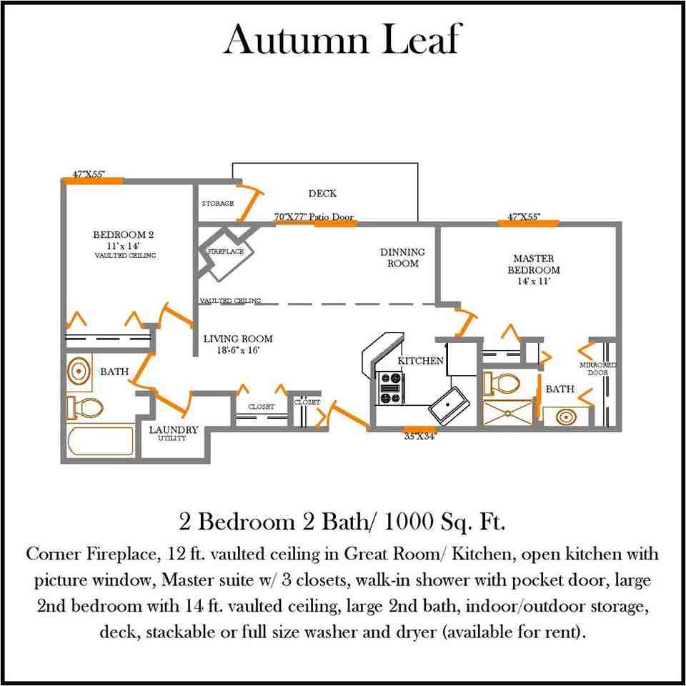 | Autumn Leaf | 2 bed | 2 bath | 1,000 sqft | $1,346 /mo | 2 units available | Our large floorplan located on the 2nd floor with a balcony, includes a living area with open kitchen, 14ft vaulted ceiling and view of the Wood burning Fireplace, picture window in kitchen, Master Suite includes a separate linen closet, large closet with bi-fold or mirrored doors, walk-in shower with pocket door, large 2nd bedroom with vaulted ceiling, large second bath with linen closet, and outdoor storage |