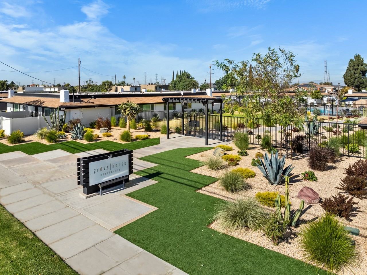 Grove House Apartments in Orange, CA, offers newly-updated, custom-designed two-bedroom apartments for rent. Our single-story homes feature exceptionally large private patios, in-unit washers and dryers, urban wood-style flooring, central air conditioning, and smart technology, among many other features! Residents enjoy relaxing by our two sparkling pools and bubbly spa, soaking in the community atmosphere, and picnics with friends at our BBQ grills. You’ll enjoy working up a sweat in our fitness center or walking through the beautifully landscaped grounds. Call or text to schedule your tour today to see all that our community has to offer! $55 per applicant 18 and older.