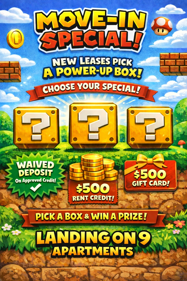 Hit Start on Your New Home! Apply and Pick a Mystery Box to unlock your reward: $500 Rent Credit $500 Gift Card $0 Deposit on approved credit Power-ups are waiting… which box will you choose?