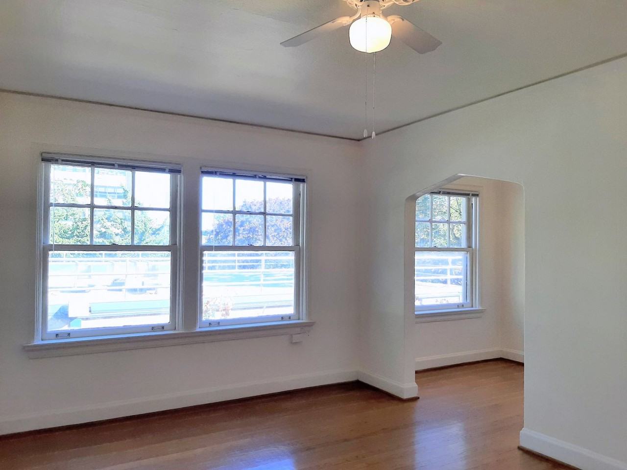 Full of period charm, this top-floor studio at the Park Regent offers classic details and modern touches. Beautiful hardwood floors and arched doorways lead into a bright kitchen and dining area, where a tiled backsplash, checkered flooring, and updated appliances complement the vintage style. A glass-fronted china cabinet provides a graceful separation between kitchen and dining space.