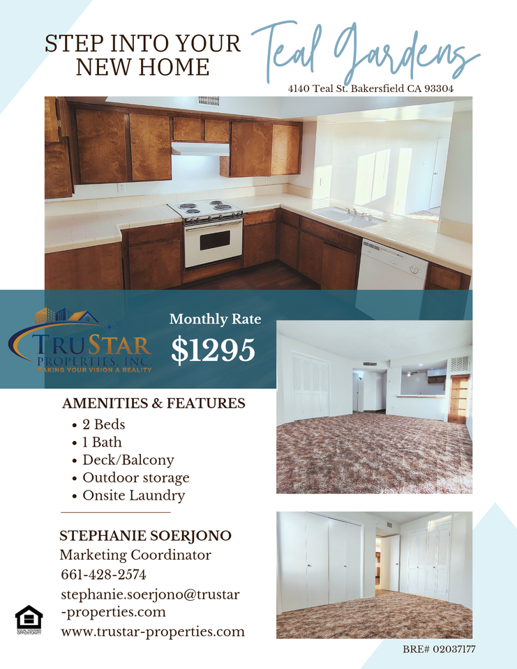 | 2/1 | 2 bed | 1 bath | 950 sqft | $1,295 /mo | 1 unit available | Teal Gardens offers comfort, convenience, and charm in a peaceful Bakersfield neighborhood. This two-story community features spacious two-bedroom apartments designed with both functionality and style. Residents enjoy bright interiors, modern appliances, and outdoor space with private patios or balconies available in select units. Unit Features ° 2 Bedrooms, 1 Bathroom ° Approximately 950 sq. ft. ° Open-concept floor plan ° Carpet, hardwood, or tile flooring options ° Fully equipped kitchen with oven, dishwasher, and garbage disposal ° Private patio or balcony (in select units) Community Amenities ° Shared coinless laundry facilities ° Off-street parking included ° On-site management ° After-hours emergency maintenance Pet Policy ✓ Cats and small dogs allowed ✓ Monthly pet rent applies (ask for more details) X No pet deposit required X No large dogs (20 lbs max) Location Teal Gardens is located in the Wible Orchard neighborhood, just off White Lane and Hughes Street. The community offers convenient access to shopping, dining, and transportation: ✓ Minutes from Singh Plaza and White & Hughes Shopping Center ✓ Close to major freeways for easy commuting ✓ Approximately 6.4 miles from California State University, Bakersfield Rental Terms ° Rent: $1,495 ° Security Deposit: $1495 Utilities included ✓ Water ✓ Trash ✓ Sewage Stephanie Soerjono TruStar Property Manager 661-428-2574 stephanie.soerjono@trustar-properties.com www trustar-properties com DRE# 02037177 | |