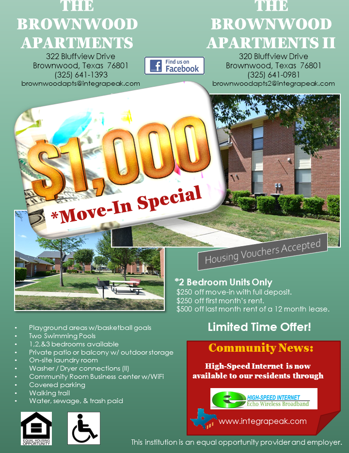 Located at 320 Bluffview Dr, Brownwood, TX 76801, USA, Brownwood Apartments II has 1 — 2 bedroom units available.