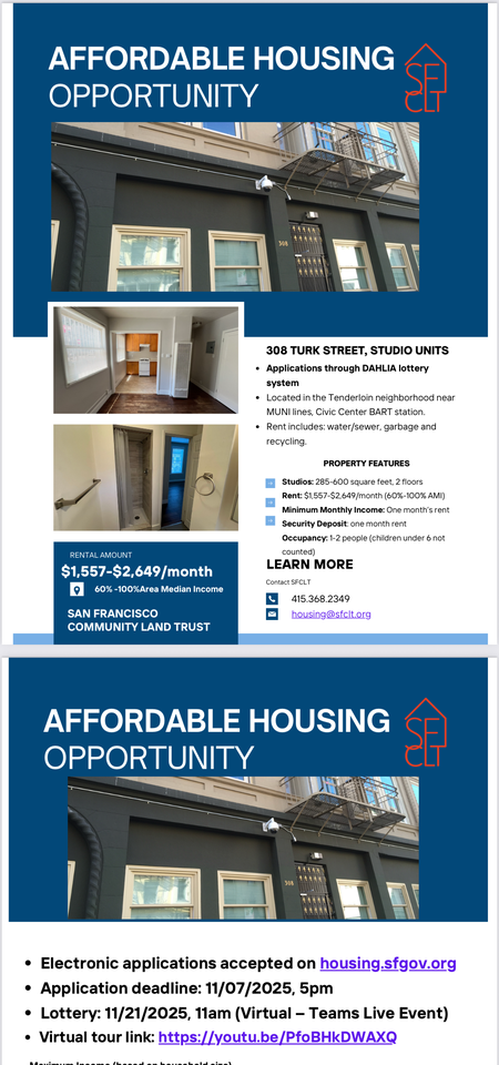 308 TURK STREET, STUDIO UNITS Applications through DAHLIA lottery system only Located in the Tenderloin neighborhood near MUNI lines, Civic Center BART station. Rent includes: water/sewer, garbage and recycling. Electronic applications accepted on housing sfgov org Application deadline: 11/07/2025, 5pm Lottery: 11/21/2025, 11am (Virtual – Teams Live Event) Virtual tour link: https youtu be PfoBHkDWAXQ PROPERTY FEATURES Studios: 285-600 square feet, 2 floors Rent: $1,557-$2,649/month (60%-100% AMI) Minimum Monthly Income: One month's rent Security Deposit: one month rent Occupancy: 1-2 people (children under 6 not counted) Maximum Income (based on household size) Households must earn no more than the income levels listed below: Household Size 1 Person 2 Person - 60% of Median Income $65,450 $74,800 - 63% of Median Income $68,750 $78,550 - 80% of Median Income $87,300 $99,750 - 100% of Median Income $109,100 $124,700 LEARN MORE 415-36-2349 **** Or see more details in the flyer.