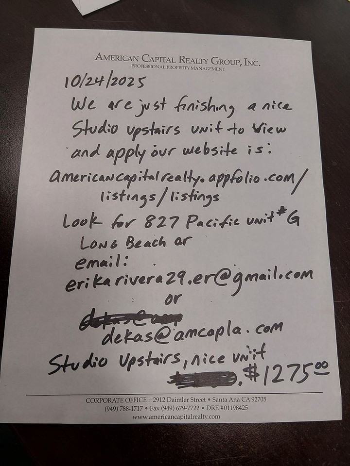 | 827PA0x1 | Studio | 1 bath | 285 sqft | $1,275 /mo | 1 unit available | Email if interested to the Downey Leasing Assistant Erika **** or Email: **** We do not have a Manager on-site, so we attempt to schedule like Open houses on the weekends, sometimes during the week Erika has some availability. The pictures posted are of the unit as it is right before we do the cleaning. The property is a smaller complex in a Residential Neighborhood real close to Transportation and shopping. Just to the northwest of the Downtown Pine Avenue Area and the Mall. Large Studio Apartment (Downstairs) Street Parking Only $1275 Monthly, $1000 Security Deposit (OAC) Recent Touch up, but looks good. Professionally Cleaned Planned prior to move-in, looks good now. Carpet to be Shampood Newer Vinyl wood type Planking Floor, Bathroom floor is more vintage tile. Gas Range Vertical Blinds For submitting an application, use our internet site: americancapitalrealty appfolio com listings listings Also we will receive a large volume of emails and will return those in the order received until we have the unit rented. Please do not contact our Corporate office, as this rental is being handled and all activity at the property site location. There is no On-site Manager, and please do not disturb the tenants. We usually remodel any newly vacated unit by Freshly Painting and the Units are Freshly Cleaned. The pictures posted are of the actual unit near completion! This current unit needs to be photographed and is prepared nicer than the photos shown. Pets- Only one Indoor Only Small Pet Dog (no dangerous breeds) or Indoor Pet Cat allowed, Additional $250 Pet Deposit required. And will consider other types of Pets such as contained in a Cage, Tank, Aquarium, a deposit could be charged with a limit of a 5 gallons size only allowed. Utilities- The Tenant pays Electric, Gas, and Trash with their Gas bill and the Owner pays Water, and Gardening on the common grounds. The tenant would have to check on the availability of Cable or Internet Services and for Satellite Dishes we do have certain Rules and Restrictions. This unit has street parking only! The application processing fee is $40 per adult. Each adult interested will have to complete an application. We will only take certified funds for the application processing fee (cashier's check or money order or cash, no personal checks). Application Processing Fees are not refundable. The maximum hold with a full deposit paid, is 10 days to Commencement a move-in. For this studio, because they are fairly large, we will take up to a maximum of 2 people. Directions- Pacific runs North South and is located just south of West 9th Street. The Property is Professionally Managed by American Capital Realty Group, Inc. (AMCAP) in Santa Ana, California Prices are subject to change, based on availability and unit improvements. | |