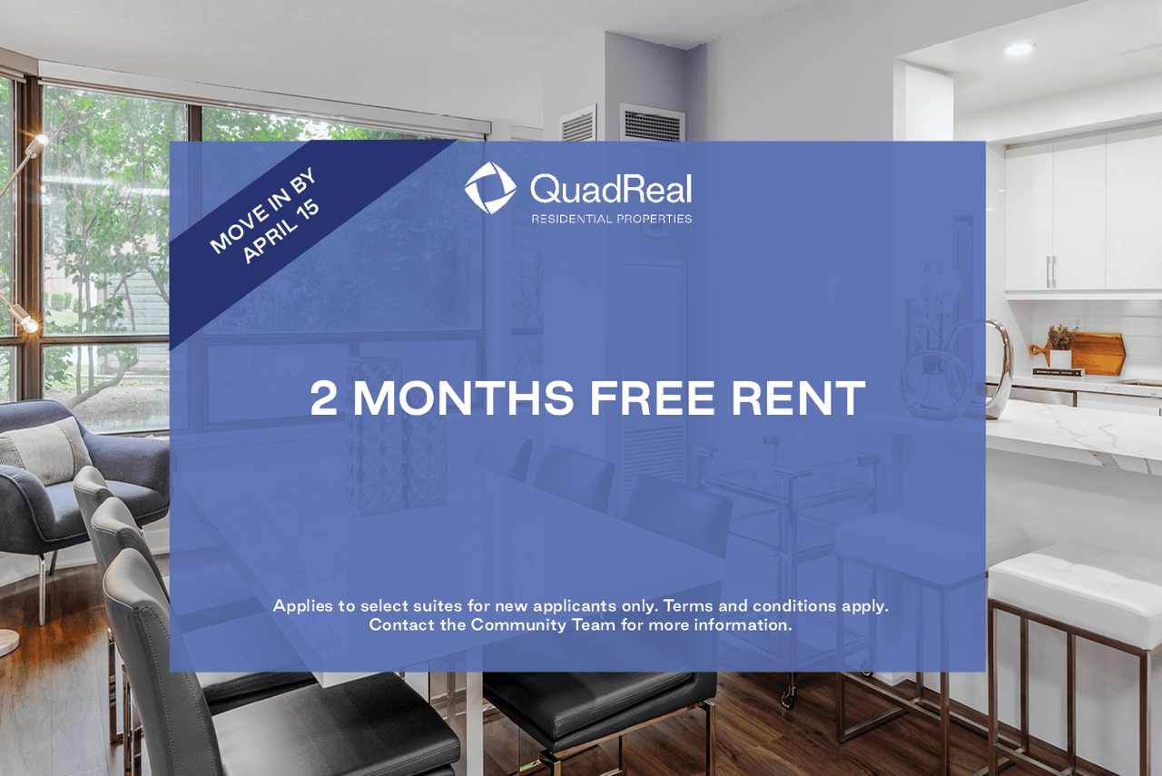 2 Months Free Rent Applies to select suites for new applicants only. Terms and conditions apply. Contact the Community Team for more information.