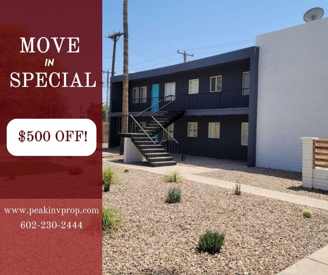 Nice large 1 bedroom unit in 4 unit building, new flooring, fresh paint inside, covered parking, large courtyard play area. Available unit is in back building by carports, Call us to see inside 602-230-8125 or apply online at www peakinvprop com Lease Length: 12 month lease Smoking Policy: Smoking is not allowed inside the unit Application Fee: $45 (non-refundable) Pet Policy: Pets are welcome! A one-time pet fee of $250 applies, plus $25/month per pet for pet rent Administrative Fee: A one-time $150 admin fee is due at move-in Security Deposit: Payable upon application approval Renter’s Insurance: A valid renter’s insurance policy is required