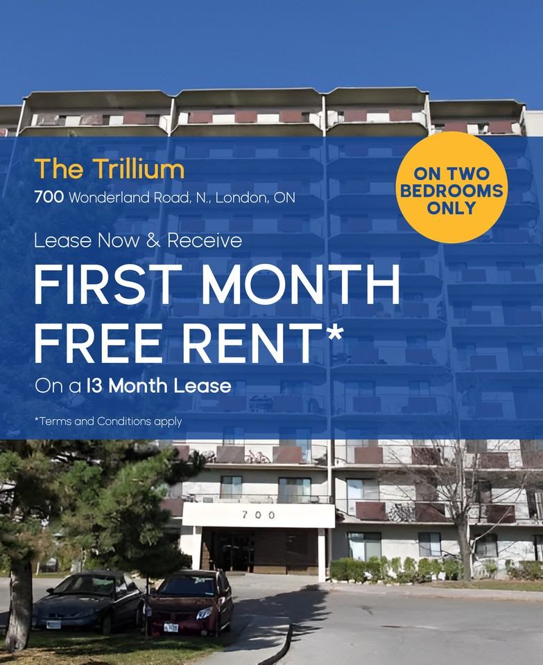 BRAND NEW RENOVATED UNITS! The Trillium is a great option for anyone looking for affordable apartments for rent in London that also offers a convenient and accessible location for shopping and getting to work or school. If you're looking for a one or two-bedroom apartment at a great price with a great mixture of bonus suite features, and a standout location, the Trillium is the way to go and is perfect for anyone who is regularly on the go. Our one and two-bedroom apartments offer a range of floor plans for our tenants, all with heat and water included in rent. Each individual suite has a balcony, walk-in closets, a dishwasher, and upper level suites offer amazing city views. Parking is also available, with covered & outdoor parking. All units also are cable and internet ready to ensure you can keep up with work, friends, and you're favourite shows soon after moving into your new home. We always try to offer extras at Drewlo, and ensure that the suites & common areas at our apartments for rent in London give you options and extras to make being a tenant easy and comfortable. The building amenities for the Trillium go above and beyond what is usually offered at affordable apartments for rent in London, with a seasonal pool, children's playground, and park with walking trails all available to our tenants right next to the building. You'll also find public transit nearby to take you to [Western](https www uwo ca ), shopping and places to eat in London's downtown core, and to London's major shopping centres like [Masonville Mall](https www cfshops com masonville-place html) But you won't have to go that far for shopping, as the stores within easy walking distance from your apartment, like Costco, Sobeys and the Rexall Pharmacy can easily cover your essentials. Contact Drewlo today to learn more about our available units in our affordable apartments for rent in London, help us find you the best place to live in London at the best possible price. Close to bus routes: 10 Wonderland, 20 Beaverbook, and 27 Capulet. - Elevators - On-site staff - Outdoor pool - Laundry facilities - Wheelchair Access - Fridge - Stove - Balconies - Carpeted floors - Park views - City views - Walk-in closets - Cable ready - Public transit - Shopping nearby - Parks nearby - Schools nearby - Internet ready - Eat-in kitchen - Rogers Cable and Bell satellite available through building cable system - Hydro paid to Wyse Meter Solutions - Secured Entry - Barrier-free access to entrance - Dishwasher - Garbage room - Video Security System Please Note: Townhomes may have multiple models available at different starting prices. Apartment prices listed are the starting price for the suite style and may be more depending on the height and view of the actual available unit.